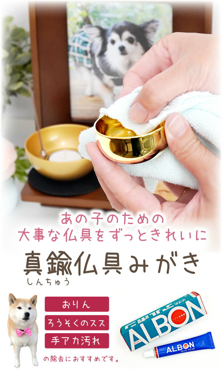 こちらもおすすめです国産の真鍮磨きクリーム「ソフトアルボン」 あの子のための大事な仏具をずっときれいに…。ご供養にお役立ていただきたい、国産の金属(真鍮)磨きクリームです。手垢汚れやろうそくのスス汚れにも◎ ペットロスの心を癒す「虹の橋のお話」詳しくはこちらのページでご案内しています> アイテム詳細 - ご使用方法 - 1.毛羽立っていない柔らかめの乾いた布にクリームを適量出します。 2.汚れている部分をやさしく磨きます。 3.乾いたきれいな布でよくカラ拭きしてください。 - 使用上の注意 - ・用途以外には使用しないでください。 ・メッキ製品、金箔面、銀箔面、白木部、塗物、ウルシ、金・銀・プラチナ等の貴金属製品には使用しないでください。 ・新品・新品同様の光沢のあるもの、ツヤ消し仕上げのもの、研磨傷が気になるものには使用しないでください。 ・皮膚の弱い方や長時間使用する場合は保護手袋をして換気のよい場所で使用してください。 ・ご使用の際は、あらかじめ目立たない部分でお試しのうえ、お使いください。 ・常温で、乳幼児やペットちゃんの手の届かないところに保管してください。 ・万一目に入った場合はこすらずにただちに水で十分に洗い流し、医師にご相談ください。 ・衣服に付着するとシミや色抜けの原因となりますのでご注意ください。 - 内容量 - 40g - サイズ - 最大幅 約9cm×高さ 約9.8cm×奥行き 約5.2cm 重量 33g ラッピングをご希望の方は「ラッピングサービス」のページをご覧いただき、ラッピングしたいお品物と一緒にカートに入れてご購入ください。 こちらもおすすめです ペットちゃんのお写真で作る、世界で一つのメモリアルクッションです。ご自宅ではもちろん、大切な方への贈り物としても。 ※関連ワード:ペット用 ペット供養 ペット仏壇 ペット仏具 メモリアルグッズ 虹の橋 動物 犬 猫 うさぎ 小鳥 文鳥 インコ ハムスター フェレット ハリネズミ はりねずみ モルモット デグー 亀 人気 思い出 ペットロス症候群 お供え 四十九日 一周忌 お盆 お彼岸 盆 彼岸 手作り 祈りの場 亡くなったペット 男の子 女の子 ディアペット お手入れ ケア ついで買い まとめ買い ポイント消化 即日 急ぎ あす楽 あすつく 20240705