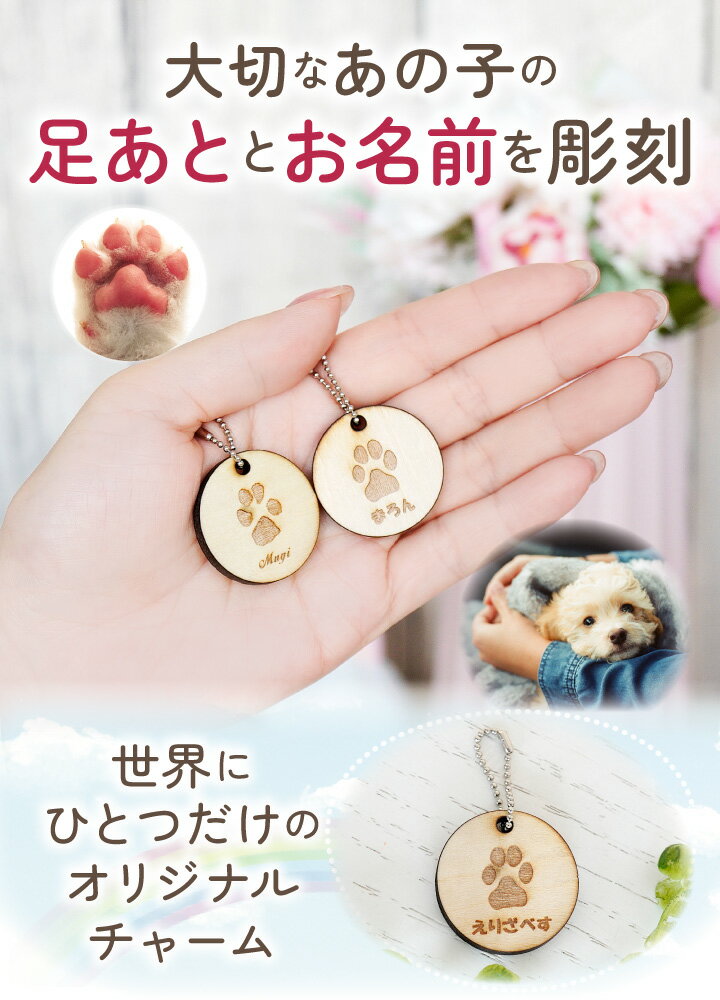 ペット 木製 うちの子 足あと チャーム 肉球 うちの子 犬 猫 メモリアルグッズ 天然木 彫刻 【ネコポス送料無料】 ペットメモリアル ペット 毛 遺髪 被毛 ストラップ キーホルダー 思い出 記念 ミニ オリジナル メモリアルグッズ 保存 ペット骨袋にも