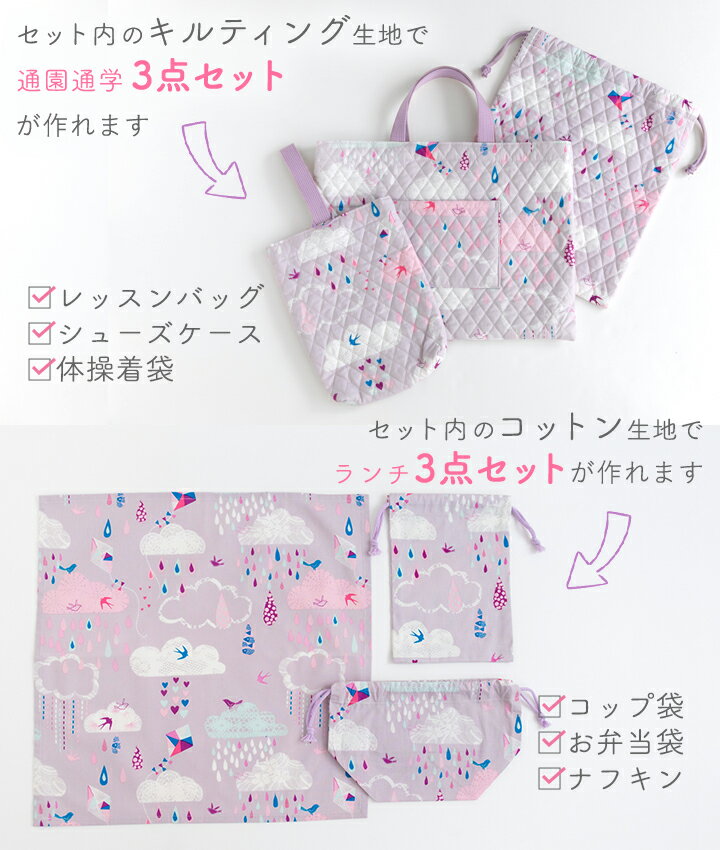 ◎早めのご注文・入園入学準備が安心です 2月〜4月上旬:混雑・人気商品の売切が予想されます ※完売したデザインは2026年入園入学シーズンの再入荷予定なし \生地の単品購入はこちら/ \完成済み既製品もございます/ 手づくりキット 入園入学6点セット 入園入学必須のアイテムが1セットで6点作れる手づくりキット。 オリジナルデザインで同柄のキルティング生地とコットン生地の他、 布に合わせたミシン糸、カバンの持ち手や巾着ひも、Dカンなどの副資材も キットに入っている、オールインワンセットです。 水通しや地直しなど、ハンドメイド初めてさんでも分かりやすいオリジナルレシピ付き。 レシピには、制作動画を見られるQRコードが記載されており、動画を見ながら作ることができます。 レッスンバッグ・体操着袋・シューズケース・コップ袋・お弁当袋・ナフキンの6点を お揃いデザインで仕上げましょう。 ■ スペック セット内容 入園入学6点セット(手づくりキット) ・キルティング生地/生地幅×85cm前後:1枚 ・コットン生地/生地幅×63cm前後:1枚 ・カラーテープ/25mm幅・1.5m巻:1個 ・カラーひも/4.5m巻:1個 ・Dカン/25mm幅:1個 ・シャッペスパンミシン糸 /200m巻普通地用:1個 ・入園入学6点セットレシピ:1セット レシピ内容 ・各アイテムの作り方 ・裁ち方図 ・水通し、地直しの仕方 ・園指定サイズへの変更の仕方 ・柄に向きがある生地の処理 ・用語解説 ・各パーツの印のつけ方 ・配色布のつけ方〈別売オプション〉 ※サイズを大きくする場合、生地が足りなくなる可能性がございます。 完成サイズ レッスンバッグ 幅:約40cm×高さ:約30cm 体操服入れ 幅:約30cm×高さ:約35cm シューズケース 幅:約17cm×高さ:約26cm×マチ:約4cm 筒回り:約42cm お弁当入れ 幅:約27cm×高さ:約17cm×マチ:約13cm 底幅:約14cm コップ入れ 幅:約17cm×高さ:約23.5cm ナフキン 約45cm×45cm ※おおよその仕上がりサイズ レシピ難易度 ★★(ビギナーさん向け)⇒レベルに合わせて選べるレシピ付き商品一覧へ 注意事項 ・柄の出方は一点ずつ商品ごとに異なります。動物や花が途中で切れる場合がございます。 ・生地の耳(白地に生地名・メーカー名などが記載されている部分)が含まれます。 ・生地のサイズは裁断上、前後する場合がございます。サイズは毎回寸分違わず絶対に正確なものではありません。 商用利用 個人商用利用可 ※レシピを利用した制作物を個人的に販売することが可能です。 (minne・Creema・ハンドメイドマーケットなどでの販売OK) ※販売時に連絡は不要です。 ※レシピの再配布は禁止です。 ※レシピには商用利用不可の記載がありますが、個人商用利用可に変更となりました。 納品書 当店では、お届けの商品に領収書・納品書を同封しておりません。 発送完了メールにて、ご購入商品一覧を記載した領収書兼納品書のダウンロードURLをご案内しております。 その他 ・ご使用のモニタ環境により、商品画像の色味が実際のものと若干異なる場合がございます。 ・在庫管理システムにより複数店舗で在庫を共有しており、ご注文のタイミングによっては在庫が確保できない場合がございます。 配送方法 宅配便(送料無料) ※この商品と巻き芯対応チケット対応商品との「巻き芯」での同梱はできかねます。「巻き芯対応チケット」を買い物かごから削除してご購入ください。 ⇒よくあるご質問はこちら ⇒生地の品質について ⇒ランチセット手づくりキットはこちら \巾着・ナフキンが5日分作れるはぎれセットもおすすめ/ ≪入園入学準備のアイディアがいっぱい!入園入学準備特集こちら≫