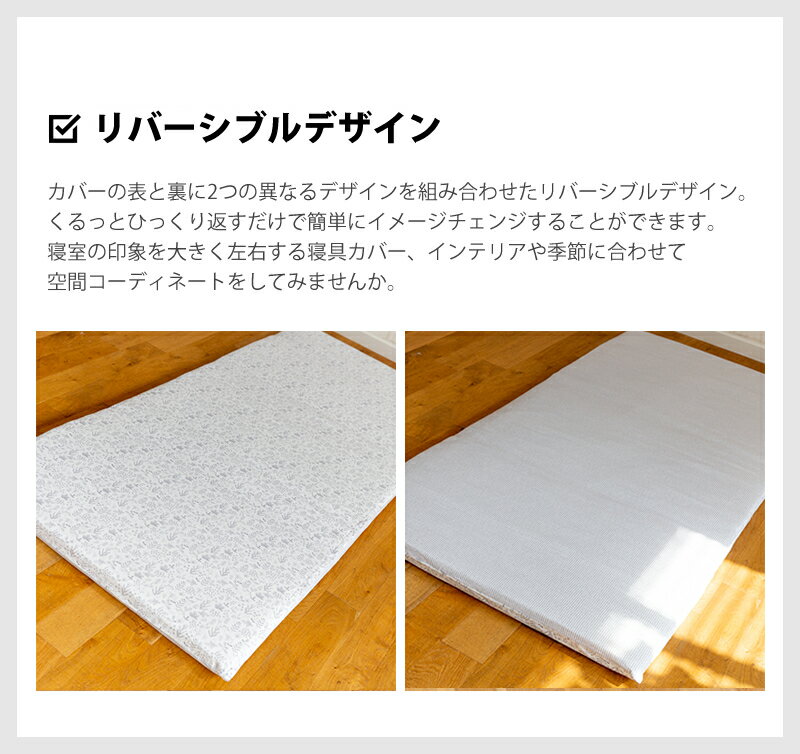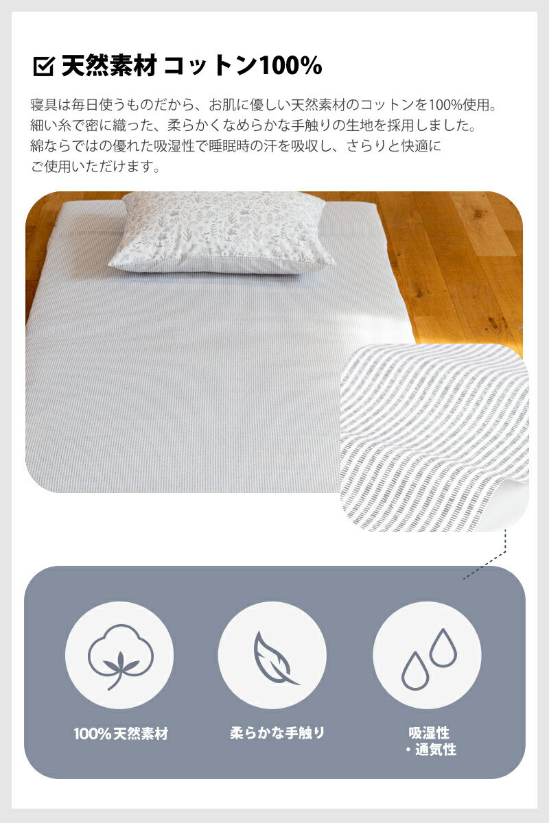 表と裏で2つのデザインを楽しめる敷布団カバー。くるっとひっくり返すと簡単にイメージチェンジができます。 デイリーライクオリジナルファブリック、ロングセラーのNATUREシリーズを使用し、当店で日本仕様に企画したオリジナル商品の本品は、綿100%でやわらかなやさしい使い心地。 スムーズに開閉できるYKKファスナーを使用しました。 表リーフ模様は「NATURE-leaf」、白地にグレーで描かれた繊細な植物模様が上品で、幅広い世代に好まれるデザイン。 反対面のストライプ模様は「NATURE - stripe」、鉛筆で丁寧にラインを引いたような、ユニセックスなデザインです。寝室の印象を大きく左右する寝具カバー、インテリアや季節に合わせて空間コーディネートをしてみませんか。◆BLACK FRIDAYクーポン対象◆ ◎イベント会場はこちら◎ 敷布団カバー シングルサイズ NATURE 表と裏で2つのデザインを楽しめる敷布団カバー。くるっとひっくり返すと簡単にイメージチェンジができます。 デイリーライクオリジナルファブリック、ロングセラーのNATUREシリーズを使用し、当店で日本仕様に企画したオリジナル商品の本品は、綿100%でやわらかなやさしい使い心地。 スムーズに開閉できるYKKファスナーを使用しました。 表リーフ模様は「NATURE-leaf」、白地にグレーで描かれた繊細な植物模様が上品で、幅広い世代に好まれるデザイン。 反対面のストライプ模様は「NATURE - stripe」、鉛筆で丁寧にラインを引いたような、ユニセックスなデザインです。寝室の印象を大きく左右する寝具カバー、インテリアや季節に合わせて空間コーディネートをしてみませんか。 ■商品詳細 対応サイズ シングルサイズ(約100cm×210cm) 枚数 敷布団カバー1枚 材質 生地:コットン100% 企画・検針 日本 生産国 日本 お手入れ方法・使用上の注意 ・お洗濯の際はカバーのファスナーを閉じ、ネットに入れて洗濯してください。 ・お洗濯により色落ちする場合がございますので、他のものと分けて洗ってください。 ・漂白剤は色落ちの原因となりますのでご使用にならないでください。 ・濡れたまま長時間放置しますと色落ちや色移りの原因となりますので避けて下さい。 ・濡れた状態や濡れたものとの摩擦で、色が移る恐れがありますのでご注意下さい。 ・タンブル乾燥機の使用は避け、洗濯後は形を整えて直ちに干して下さい。 注意事項 ・枕カバー、掛け布団カバーは別売りです。 ・サイズには多少の誤差がございます。 パッケージについて ・パッケージデザインが予告なしに変更する場合がございます。 領収書・納品書について 当店では、お届けの商品に領収書・納品書を同封しておりません。 発送完了メールにて、ご購入商品一覧を記載した領収書兼納品書のダウンロードURLをご案内しております。 その他 ・ご使用のモニタ環境により、商品画像の色味が実物と若干異なる場合がございます。 ・複数店舗で在庫情報を共有しているため、ご注文のタイミングによっては在庫が確保できない場合がございます。 配送方法 宅配便のみ ⇒よくあるご質問はこちら ■ 関連商品 ≫ 寝具カバー ≫ NATURE シリーズ [srs00002]