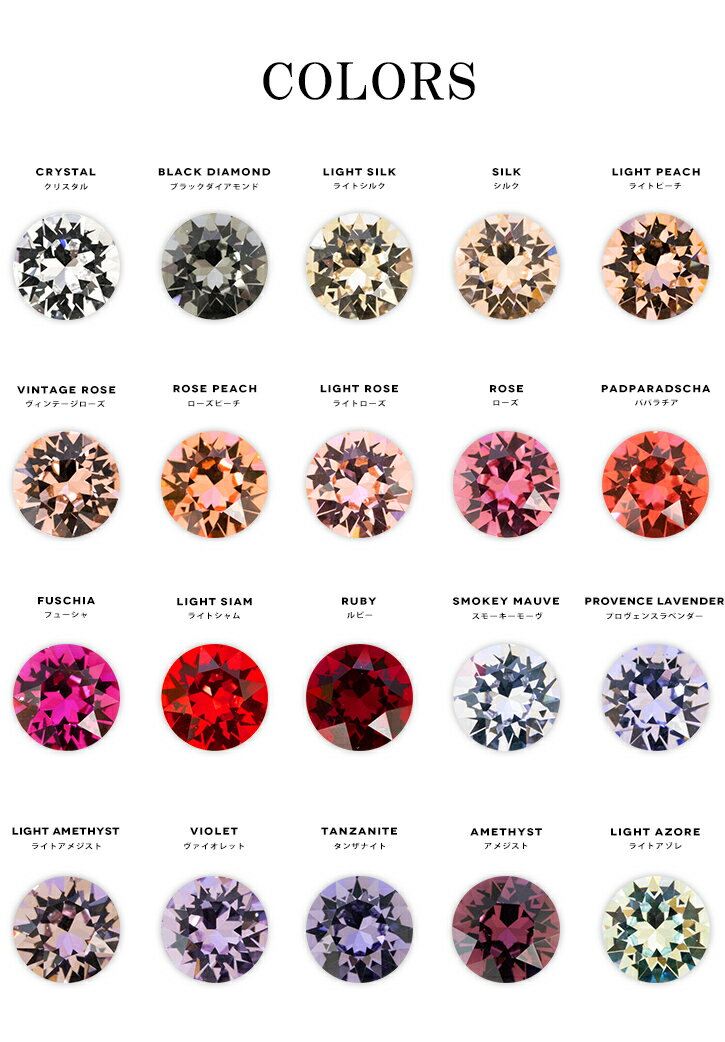 本商品はご注文タイミングやご注文内容によっては、購入履歴からのご注文キャンセル、修正を受け付けることができない場合がございます。 特徴 XIRIUS CHATON #1088 スワロフスキーチャトンとは裏面がV字カットになっている、ダイヤモンドカットのような形状のストーン。 平面のflatbacksと違い、深さのあるダイヤカットの為、複雑なカットが作り出す輝きは格別で、 ネイルアートはもちろん、アクセサリーパーツ、グルーデコの大定番となっているマストアイテムです。 スワロフスキー ラインストーン ヴェルサイユ宮殿や、オペラ劇場のシャンデリア等を手掛ける、SWAROVSKI社製のクリスタルラインストーン。通常のクリスタルに比べ、酸化鉛が最低32%と多くなっている為、光の反射加減により、虹色に見える事があります。 長い歴史に培われた、高品質の輝きをお試しください。 カラー 厳選 大定番の暖色系20カラー クリスタル/ブラックダイアモンド/ライトシルク/シルク/ライトピーチ/ヴィンテージローズ/ローズピーチ/ライトローズ/ローズ/パパラチア/フューシャ/ライトシャム/ルビー/スモーキーモーヴ/プロヴェンスラヴェンダー/ライトアメジスト/ヴァイオレット/タンザナイト/アメジスト/ライトアゾレ ▼ その他チャトン サイズ・カラーをお探しの方はコチラ ▼ 同サイズの寒色系20色はコチラ 大き目サイズ(ss29 ss39)暖色系20色はコチラ 大き目サイズ(ss29 ss39)寒色系20色はコチラ オーロラカラー(クリスタルAB)はコチラ サイズ pp14(2.0mm〜2.1mm) / pp18(2.4mm〜2.5mm) / pp24(3.0mm〜3.2mm) / pp31(3.8mm〜4.0mm) / ss24(5.27mm〜5.44mm) 入数 pp14(40粒) / pp18(35粒) / pp24(30粒) / pp31(25粒) / ss24(15粒) ネコポス OK その他注意事項 お使いのブラウザや、画面設定により商品のカラーが異なって見える場合がございます。 同サイズ・同カラー大量注文で、特に指定がない場合、パッケージでの発送をする場合がございます。 ■ネコポスをご利用の場合のご注意■ ・ネコポスは手渡しではなく、ポストへ直接投函となります。 その為、代金引換や日時指定は出来ません。 追跡サービス有り。 ・ 配達時の欠損・盗難・不達・延着など保証がございません。 詳しくは配送についてをご確認の上ご利用くださいますようお願い申し上げます。