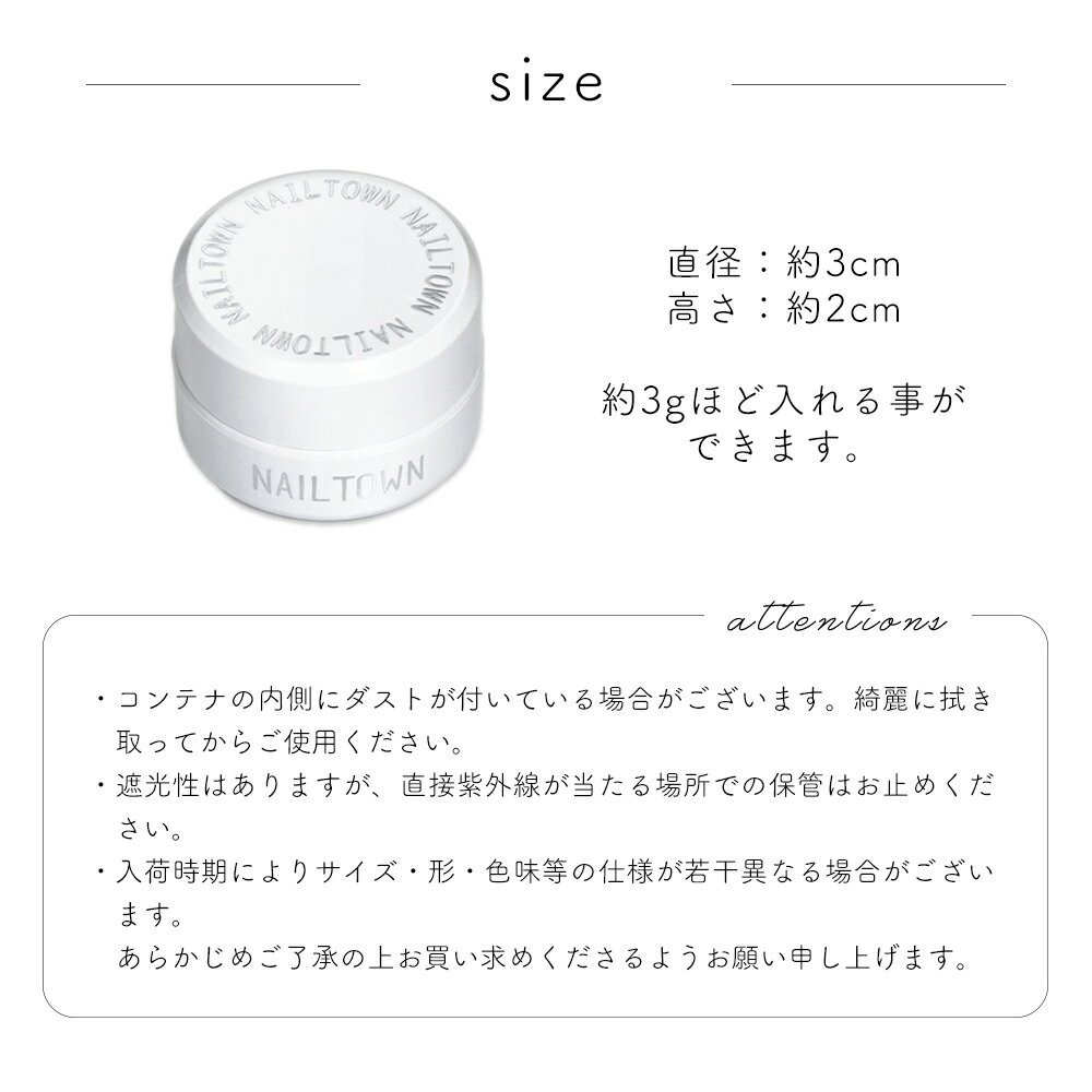 本商品はご注文タイミングやご注文内容によっては、購入履歴からのご注文キャンセル、修正を受け付けることができない場合がございます。 特徴 便利なネイルツール! 『NAILTOWN GEL コンテナ』が新登場〇゜ ジェルやラメの調合・保存などに♪ 様々な用途に最適なコンテナ! 大容量ジェルの小分けにも便利◎ サイズ 直径:約3cm 高さ:約2cm ジェルを約3gほど入れる事ができます。 ネコポス 発送可能 注意事項 ・コンテナ内部にダストが付いている場合がございます。綺麗に拭き取ってからご使用ください。 ・遮光性はありますが、直接紫外線が当たる場所での保管はお止めください。 ・入荷時期によりサイズ・形・色味等の仕様が若干異なる場合がございます。 あらかじめご了承の上、お買い求めくださるようお願い申し上げます。 ■ネコポスをご利用の場合のご注意■ ・ネコポスは手渡しではなく、ポストへ直接投函となります。 その為、代金引換や日時指定は出来ません。 ・追跡サービス有り。 ・ 配達時の欠損・盗難・不達・延着など保証がございません。 詳しくは配送についてをご確認の上ご利用くださいますようお願い申し上げます。