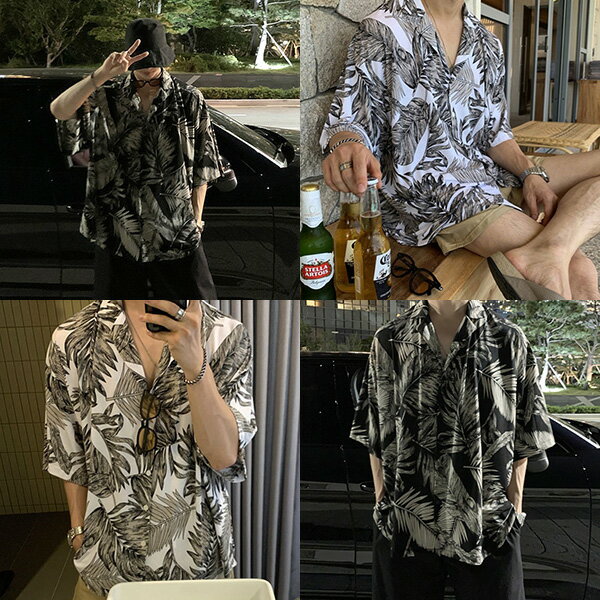 柄シャツ 草木柄 植物柄 アロハ アロハシャツ ヤシ パームツリー 南国 ボタニカル モノトーン 白黒 ホワイト 白 ブラック 黒 半袖 半袖シャツ オーバーサイズ 衣装 韓国 大きいサイズ 個性的 春服 夏服