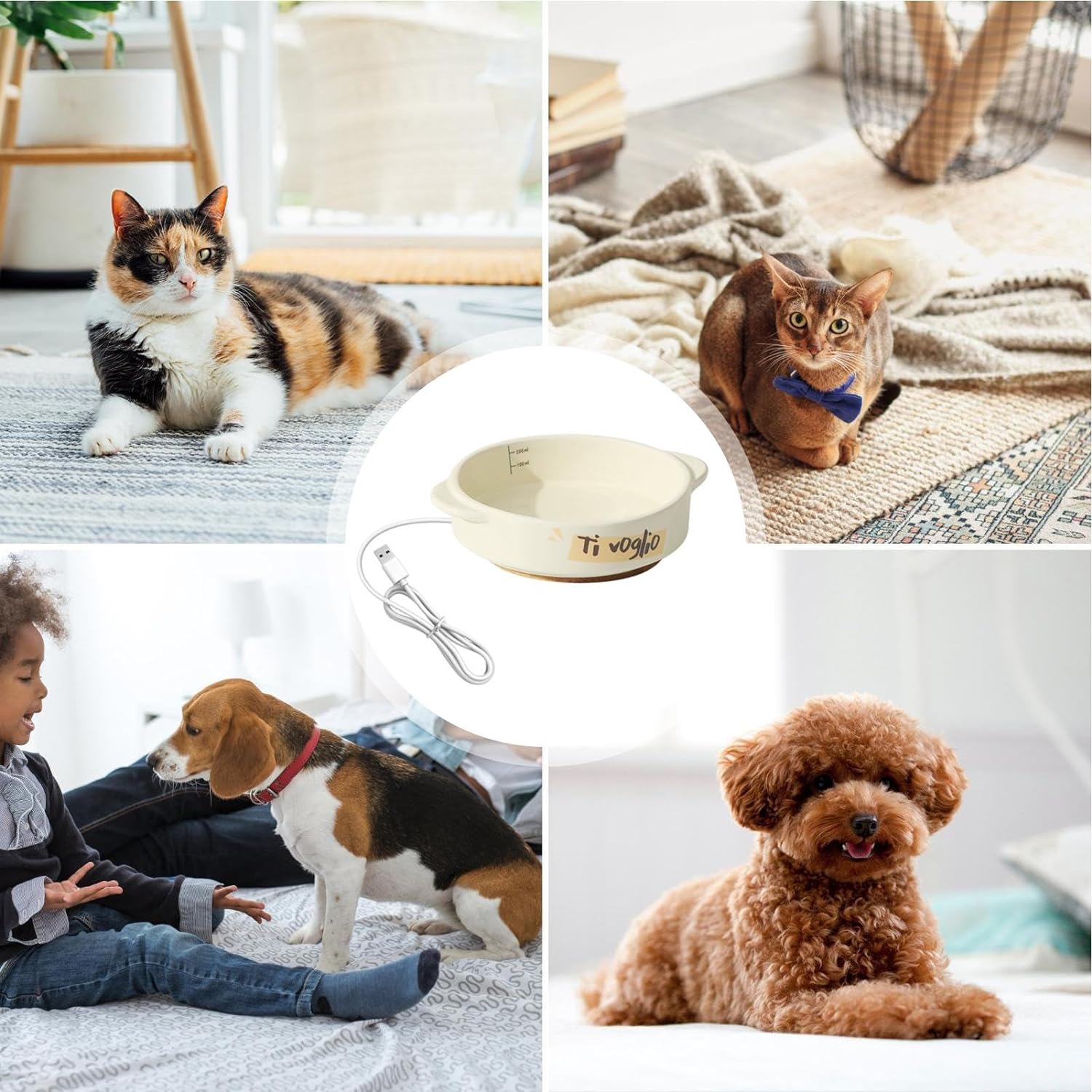 【丁寧な作り】この犬用温水ボウルは耐久性のあるセラミック素材で作られており、非導電性と高度な断熱性を提供します。放熱と省エネのための底部の丸い穴のデザインが特徴です。 [簡単に適用] 犬用の温水ボウルで、毛むくじゃらのお友達に完璧なボウルを手に入れましょう。サイズは浅型と深型の2種類があり、後者は水や食品を入れるのに700mlの大容量です。浅めのボウルは350mlの容量ですが、どちらも洗いやすく使いやすいです。 [ケーブルを噛むことはもうありません] この加熱された犬用水ボウルの噛まれにくいケーブルにより、ペットが損傷することはありません。 USBソケットが付属しており、1.5mの長さのケーブルで簡単に抜き差しできます。 【幅広い用途に】この温水ボウルを使用すると、寒い冬に餌と水の温度を維持しながら、ペットに餌を与え、水分補給を続けることができます。猫、犬、ウサギ、鶏などのために設計されており、毛皮で覆われたお友達に温かい食事と健康的な飲み物を与えてください。 【革新的な加熱】USB電源を使用して安全かつ便利に加熱できる犬用温水ボウルで、ペットの食べ物と水を快適な35度に保ちます。最適な胃腸の健康を促進しながら、感電や空焚きの危険を回避します。
