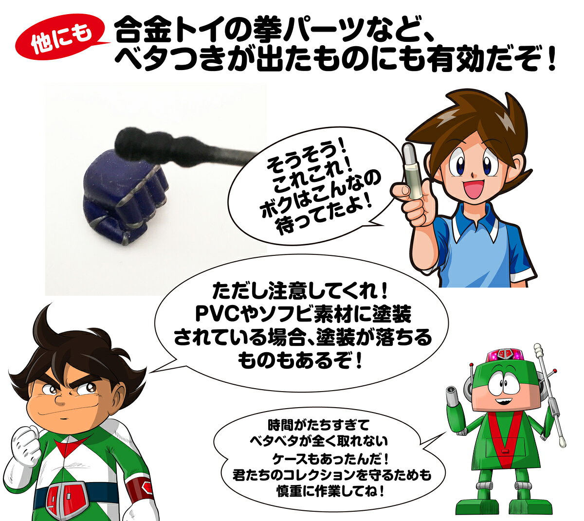 商品情報お知らせ2021年9月21日出荷分より原料の生産ロットが変更となる為、液色が【極わずかに黄色〜やや黄色】の範囲で調整されます。液色が変更となりましても従来通りの性能に変更はなく問題ありません。製造国日本内容ベタつき落とし専用クリーナー(50ml)×1本専用クロス×2枚綿棒×2本用途フィギュア等に発生する表面の”べたつき”を完全に除去する専用クリーナーです商品サイズ190mm×120mm×30mm(H)※パックサイズ45mm×25mm×115mm(H)※本体容器140mm×160mm※クロス 追加仕様ご要望の多かった大容量タイプですベタトルV goキング シリーズ 【GOV-500R】樹脂パーツ表面のベタつきをしっかり落とす PVC ソフビ フィギュア 洗い方 中古 水洗い不要 クリーナー お手入れ きれい ホコリ除去 メンテナンス titanium glas ジャパンケミテック 【送料無料】PVCソフビ樹脂パーツ表面のベタつきをしっかり落とす なあキミ!カプセルトイや食玩なんかのフィギュア、集めてる?俺はそういうの集めるのも飾るのも大好きなんだ!でもさ、あーゆーのって、時間が経つとベタベタしてくるじゃん?それにホコリがたまってさ、ティッシュで拭いて取れればいいけどビリビリに破けてひっついちゃったりするでしょ?そーゆーのは水で洗ったりするんだけど、ベタベタの対処には最悪なんだって!かえって状況を悪化させるらしい…。知らなかったぜ!!じゃーどうすりゃいいの?もー見た目も気持ちも悪いしさ〜。でも捨てたくないよね…でも安心しな!俺と「ベタトルV」に任せときゃもうだ丈夫だぜ!大事なコレクション、ベタベタだからってまだ捨てるなよ! 2