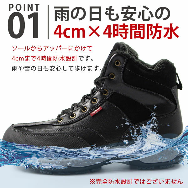 ■おすすめポイント ・4cm×4時間の防水設計で雨の日も靴内が濡れにくいので、安心して歩けます。※完全防水ではございません。 ・履き口部分にはボア、靴内はウレタン素材を使用しているので、保温性があり、温かいです。 ・靴底は溝が深く、グリップ力があるので、滑りにくく安心して歩くことができます。 ■ブランド EDWIN エドウィン ■商品名/品番 EDS-9120 ■カラー 1.ブラック 黒色 2.ブラウン 茶色 ■取扱いサイズ 25cm 25.5cm 26cm 26.5cm 27cm 28cm ■素材 《アッパー》合成皮革 《アウトソール》合成底 ■ワイズ(横幅) 標準的な2E(EE)相当 ■靴の詳細 (26.5cm採寸) 《ソール高》接地面より約 4.5 cm 《履き口までの高さ》約 16.0 cm(ソール部分も含む) 《履き口周り》紐を結んで調節出来ます 《重量》片足 約 400 g ■サイズについて こちらの商品は【標準サイズより大きめ】です。普段お履きのサイズより0.5cm小さいサイズをお選び下さい。 幅広・甲高の方は普段お履きのサイズをお選び下さい。 【男性スタッフ堺(169cm) 普段のサイズは、革靴26cm/日本製スニーカー26.5cmです】 私のジャストサイズは26cmでした。靴下を履いて、程よいフィット感のあるサイズです。■商品詳細 ■ブランド EDWIN エドウィン ■商品名/品番 EDS-9120 ■カラー 1.ブラック 黒色 2.ブラウン 茶色 ■取扱いサイズ 25cm 25.5cm 26cm 26.5cm 27cm 28cm ■素材 《アッパー》合成皮革 《アウトソール》合成底 ■ワイズ(横幅) 標準的な2E(EE)相当 ■靴の詳細 (26.5cm採寸) 《ソール高》接地面より約 4.5 cm 《履き口までの高さ》約 16.0 cm(ソール部分も含む) 《履き口周り》紐を結んで調節出来ます 《重量》片足 約 400 g ■サイズについて こちらの商品は【標準サイズより大きめ】です。普段お履きのサイズより0.5cm小さいサイズをお選び下さい。 幅広・甲高の方は普段お履きのサイズをお選び下さい。 【男性スタッフ堺(169cm) 普段のサイズは、革靴26cm/日本製スニーカー26.5cmです】 私のジャストサイズは26cmでした。靴下を履いて、程よいフィット感のあるサイズです。