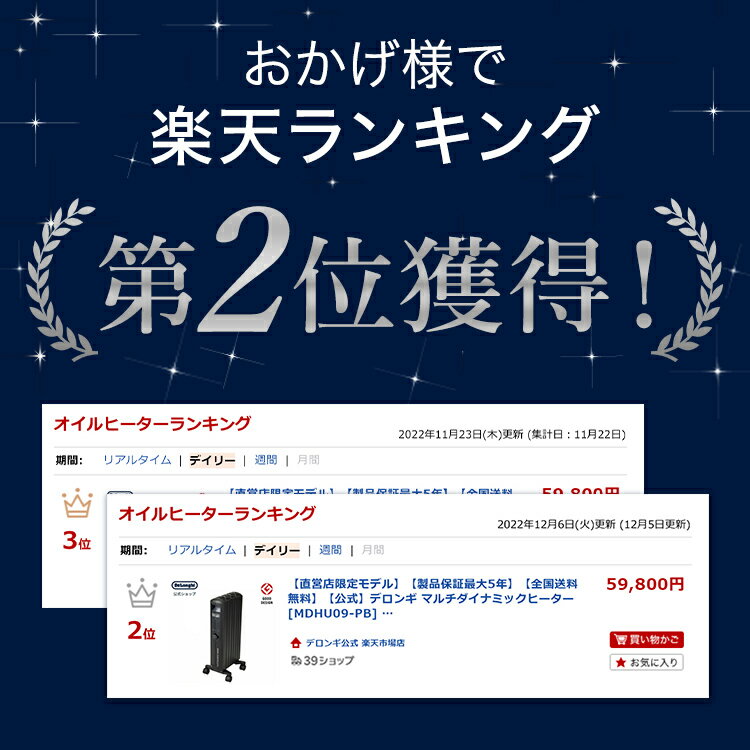 商品コード MDHU09-PB 商品名 デロンギ マルチダイナミックヒーター 色 マットブラック 電圧/周波数 100V(50/60Hz) 消費電力 900W 外形寸法/重量 長さ:370mm 幅:275mm 高さ:665mm 本体重量:8.5Kg コード長 2.5m 適用畳数 6※1〜8※2畳 平均表面温度 約60℃ 保証期間 3年 ※1 日本電機工業会自主基準 ※2 デロンギ自社実験による。試験条件:新省エネルギー基準 外気温5℃、5面接触 「ヒーター」「暖房器具」「暖房機」「暖房機器」「暖房」「省エネ」 メーカー希望小売価格はメーカーサイトに基づいて掲載していますメーカー希望小売価格はメーカーサイトに基づいて掲載しています おしゃれ かっこいい 贈り物 ギフト プレゼント 新生活 送料無料 簡単 休日 リラックス 冬用 寝室室温キープ率圧倒的No.1* 高精度な温度コントロールで、真冬の厳しい環境でも設定した室温を±0.1℃の範囲でしっかりキープ。 従来の2倍*素早く暖める 外気温が5℃の寒い冬でも、室温が20℃に達するまでに必要な時間は、わずか25分です。 快適に節電 「オートアダプティブテクノロジー」で、部屋を暖めすぎることがないため、節電効率が高く電力消費を抑えられます。 呼吸音よりも静かな運転音 極寒の日にフル稼働させても運転音は静か。寝室はもちろん、勉強に集中したい時、映画や音楽を楽しみたい時にもおすすめです。 デロンギ ヒーター「ゼロ風暖房」の特長 部屋全体を暖める 遠く離れた太陽が地球を暖めるように、デロンギ ヒーターも部屋と私たちを暖めます。輻射熱で床や壁、天井まで熱を伝え、部屋中快適です。 肌も喉も乾燥しにくい デロンギヒーターは肌の水分量をしっかりキープ。乾燥による喉の痛みもなく、快適にすごせます。 空気を汚さない 室内のホコリやハウスダスト、ペットの体毛などを巻き上げることがありません。発火、燃焼もないため、空気を汚しません。 やけどしにくい表面温度 デロンギだけの先進技術で、触れてもやけどしにくい平均表面温度約60℃を実現。 使いやすさと快適性を両立 シンプルで使いやすい 直感的な操作が可能なクリックノブ。 燃料の補充や交換は一切不要 マルチダイナミックヒーターは電気の力で製品内部の金属モジュールを温めて放熱。燃料の補充や交換の手間は一切ありません。 チャイルドロック機能 チャイルドロック機能でボタン操作を無効にして、お子様による誤作動を防ぎます。 折りたたみ式キャスター 組立て不要で移動に便利な折りたたみ式キャスターを採用。ヒーターを裏返してネジでキャスターと台座を固定するような組み立ての手間は一切ありません。 トップハンガー(別売り) デロンギヒーターと一緒にお使いいただけるトップハンガー。衣類やタオルなどの温めに便利です。【型番】TMP-22XM ヒーター 6畳 7畳 8畳 ヒーター 静か 子供部屋 ヒーター ヒーター 脱衣所 ヒーター 軽量 ヒーター 節電 ヒーター 静か ヒーター 乾燥しない ヒーター 温度調整