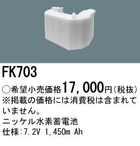 パナソニック製 FK703 誘導灯・非常灯バッテリー パナソニック製の誘導灯・非常灯バッテリーFK703です。 FK703の仕様 7.2V1450mAh ニッケル水素電池 国土交通大臣認定