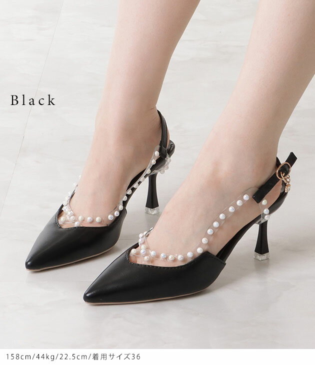 ポインテッドラインパールストラップパンプス 女性 レディース ピンヒール サイドオープン サンダル ミュール モチーフ 華やか 上品 レディ フェミニン クリア 抜け感 カジュアル オフィス セレモニー デート 合コン パーティー ブラック ホワイト