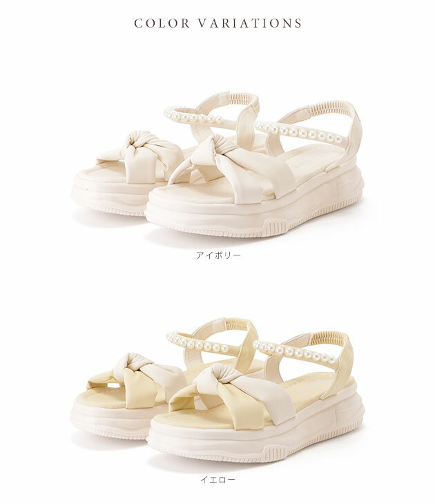 パール付きクロスリボンコンフォートサンダル 女性 レディース ボリュームソール 厚底 フラット バックストラップ レザー調 結びデザイン 快適 楽ちん カジュアル スポーティ フェミニン シンプル ミニマル 春 夏 イエロー アイボリー