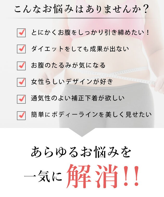 ⇒ 買い物ガイドはこちら■商品説明 気になるウエストからお腹まわりのボリュームを抑えてくれる、シェイプアップサポーター。 フロントファスナーで着脱がしやすく、普段使いにも重宝するアイテムです。 内側には2列のホックバンドがセットされており、内側からしっかりとウエストラインを整えてくれるのがうれしいところ。 外部ファスナーを閉じることで、助骨を締めながら女性らしく引き締まったウエストに。 お腹のボリュームを抑えているので、自然と食欲抑制効果が期待できるのもポイントです。 通気性に優れているので汗ばむ季節にも使いやすく、オールシーズンで活躍してくれる補正インナーとなっています。 ■ディテール ・伸縮性:なし ・透け感:あり ・裏地:なし ■適応体重 【M】約51-60kg 【L】約60-69kg 【XL】約69-78kg 【XXL】約78-90kg ■サイズの目安(cm) ※ヌードサイズ 【M】ウエスト:64-70、ヒップ:86-96 【L】ウエスト:70-76、ヒップ:89-99 【XL】ウエスト:76-82、ヒップ:92-102 【XXL】ウエスト:82-88、ヒップ:95-105 ■サイズの目安(cm) ※平置き実寸 【M】総丈:29、アンダーバスト幅:26.5、ウエスト幅:25.5 【L】総丈:29、アンダーバスト幅:29、ウエスト幅:28 【XL】総丈:29、アンダーバスト幅:30.5、ウエスト幅:29.5 【XXL】総丈:29、アンダーバスト幅:32.5、ウエスト幅:32 ■素材 ナイロン80%、 ポリウレタン20% ■モデル情報 - ■原産国 MADE IN CHINA ■注意点 ・色合いはモニター環境により若干の誤差が出る場合がございます。 ・サイズは平置きサイズとなりますので、測り方によっては誤差が生じる場合がございます。 ・入荷・生産時期により、色、サイズ、素材などが多少異なる場合がございます。 ・本製品は生産過程におきまして、生地を織る際の糸の継ぎ目や多少のほつれが生じることがあります。 ・お手頃な価格で提供しているため、簡易包装となっており、保管・梱包時にシワが生じる場合がございます。 ・靴商品は商品箱が破損している場合がございます。 ・上記の点についてあらかじめご了承いただきますようお願い申し上げます。