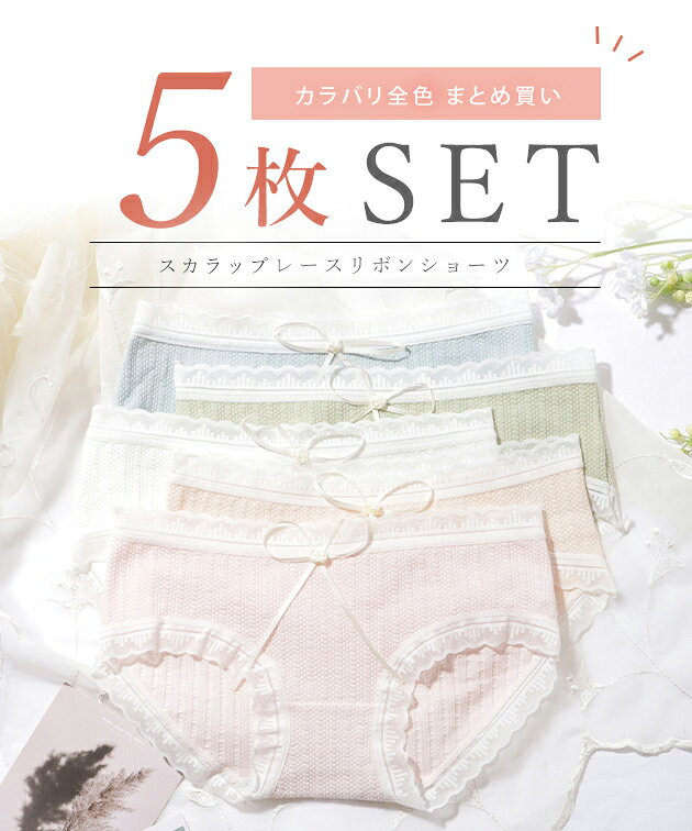 【5枚セット】 スカラップ レース フレンチ ストライプ リボン ショーツ 女性 レディース 下着 パンツ 三角 秋 冬 ミドル丈 バイカラー スカラップ シアー 華奢 可愛い キュート ロマンチック ガーリー 抗菌 コットン 綿 通気性 ソフト
