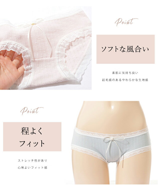 ⇒ 買い物ガイドはこちら■商品説明 デリケートなお肌にも心地良い、コットン混素材のショーツ。 やわらかなカラーリングが女性らしい、5色セットでご用意しました。 わずかに起毛しているソフトな生地感で、素肌にやさしく馴染むひと品。 凹凸でストライプを表現した、フレンチシックな可愛らしさも魅力です。 縁にはスカラップレースをあしらい、さりげない甘さをプラス。 通気性に優れているので、季節を問わずさらりと快適にお過ごしいただけます。 普段使いにはもちろん、旅行などの特別な日にも◎ ■サイズ(cm) 【M】総丈:18.8 / ウエスト幅:28 【L】総丈:19.4 / ウエスト幅:29.5 【XL】総丈:21.5 / ウエスト幅:30.7 ■素材 生地: コットン(綿)95%, ポリウレタン5% ■モデル情報 - ■原産国 MADE IN CHINA ■注意点 ・色合いはモニター環境により若干の誤差が出る場合がございます。 ・サイズは平置きサイズとなりますので、測り方によっては誤差が生じる場合がございます。 ・入荷・生産時期により、色、サイズ、素材などが多少異なる場合がございます。 ・本製品は生産過程におきまして、生地を織る際の糸の継ぎ目や多少のほつれが生じることがあります。 ・お手頃な価格で提供しているため、簡易包装となっており、保管・梱包時にシワが生じる場合がございます。 ・靴商品は商品箱が破損している場合がございます。 ・上記の点についてあらかじめご了承いただきますようお願い申し上げます。