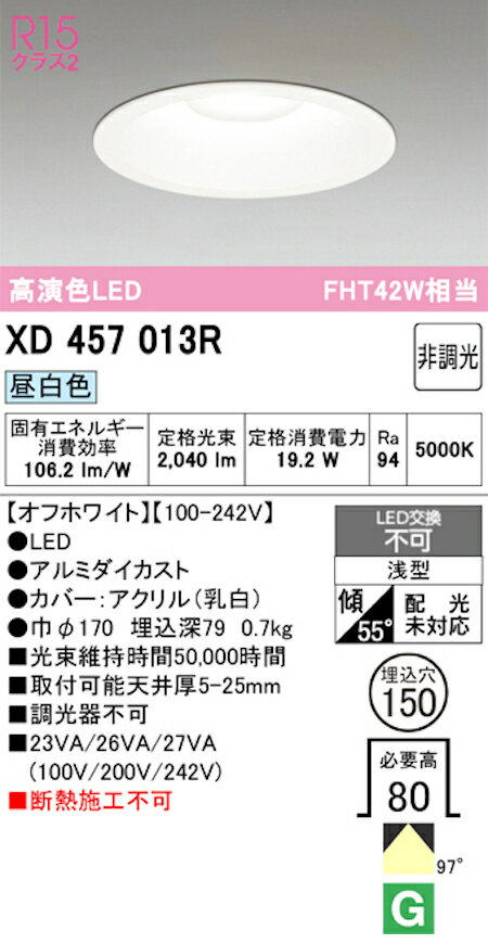 オーデリック XD457013R LED一体型ダウンライト Φ150 非調光 FHT42W相当 昼白色 オフホワイト