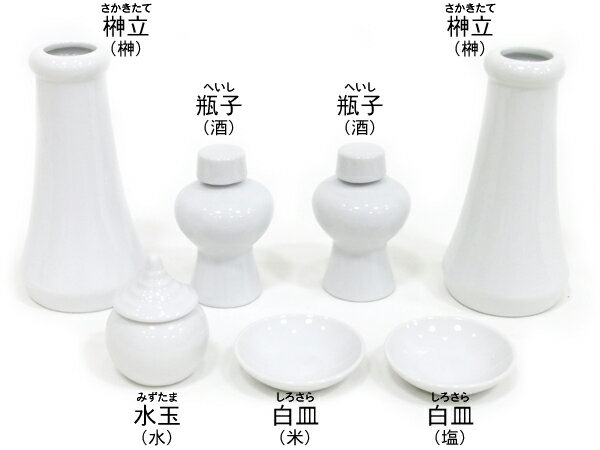 白皿×2個、瓶子(へいじ)×2個、水玉、榊立×2個のセットです。 商品の詳しい説明 白皿:1.5寸(径4.3×高1cm) 瓶子:2寸(径4×高7cm) 水玉:1寸(径4×高5cm) 榊立:3寸(径5.5cm×高9cm) こちらのセットには長手三方5.0寸がピッタリです。 ※ご注文の時期によって、サイズ・デザインが異なる場合がございます。予備などをご希望の方はまとめてのご購入をおすすめいたします。 コンパクトでおしゃれな北欧風神具セットはこちら 「壁掛け」「棚置き」どちらもできるオシャレな神棚北欧風神棚額はこちら