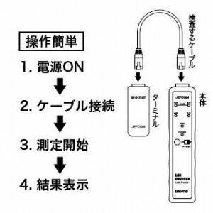 【特長】●1回のボタン操作で、導通チェックを判別。●CAT5e/CAT6対応(RJ45モジュラープラグ)。●小型・軽量なスリムタイプ。●音と光で判別しやすい。●LANケーブルの導通チェック断線、結線ミスを確認。●ケーブル布設後の離れた位置でもチェックOK。●結果を音と光で表示。●クロスケーブル対応。●オープン、ショート、誤配線の検出が可能。●ローバッテリー表示付。●パワーセーブ機能。●電話線アダプター(別売)を使用して通信線のチェックができる。【仕様】●メーカー:ジェフコム●型番:LNC110●商品名:LANチェッカー●本体サイズ(mm):32×142×25.3●本体質量:102g(電池含)●ターミナルサイズ(mm):26×59.6×22.6●ターミナル質量:20g【セット内容】●本体×1●ターミナル×1●RJ45パッチコード×2●乾電池006P・9V×1(動作確認用)●収納バッグ×1
