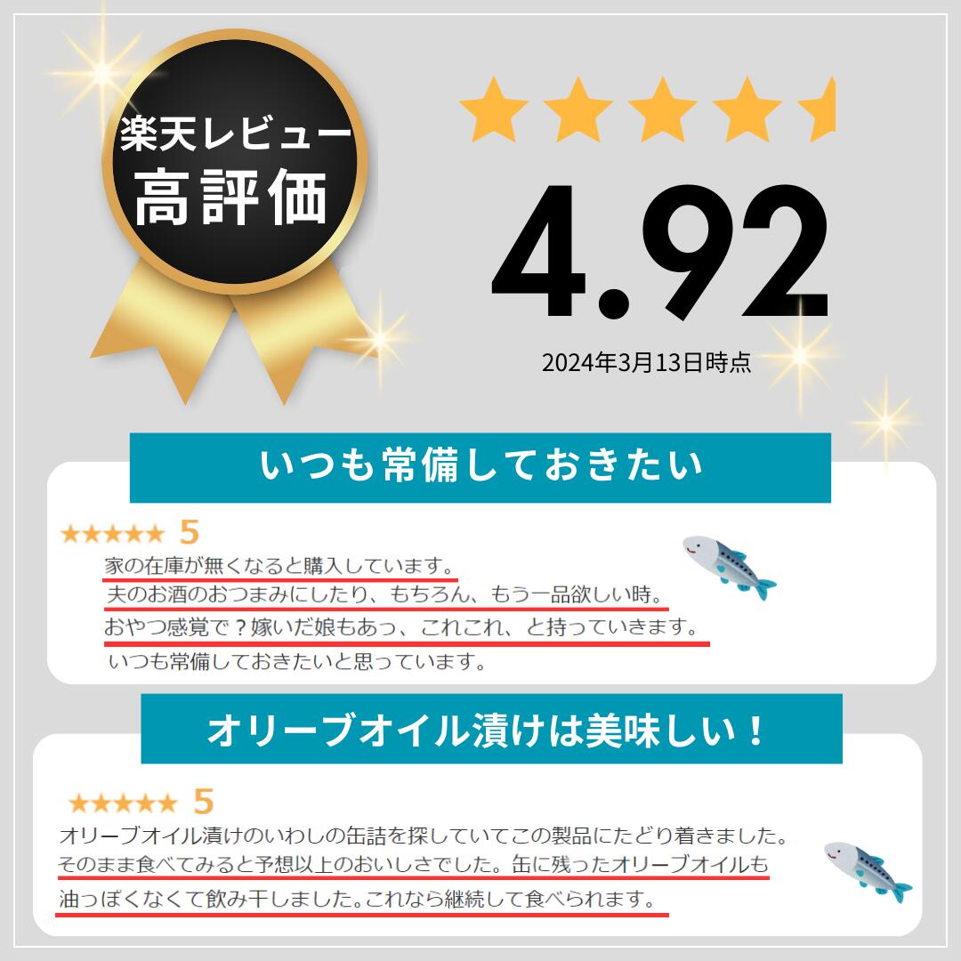 【レビューキャンペーン開催中!】 オリーブオイル使用のいわし油漬の缶詰。 丸々としたいわしにオリーブオイル特有のさわやかな味わい。お惣菜としてもお料理の素材としても、オイルまで無駄なく使えます。 【内容量】(固形量70g、内容総量100g) 【原材料名】いわし(国産)、オリーブオイル、食塩/調味料(アミノ酸) 【賞味期間】常温3年(賞味期限が1/3(1年)以上残っているものをお届け致します) 栄養成分表示:1缶(100g)当たり 熱量(kcal):316 たんぱく質(g):15.7 脂質(g):28.0 炭水化物(g):0.2 食塩相当量(g):1.0 カルシウム(mg):215 DHA(mg):1303 EPA(mg):1750 【検索関連ワード】オリーブオイルサーディン オイルサーディン いわし イワシ オリーブオイル 缶詰 缶詰め オメガ3脂肪酸 EPA DHA カルシウム 国産 長期保存 非常食 ローリングストック おいしい 美味しい おすすめ オススメ 人気 料理 健康 ギフト プレゼント 母の日 父の日 敬老の日