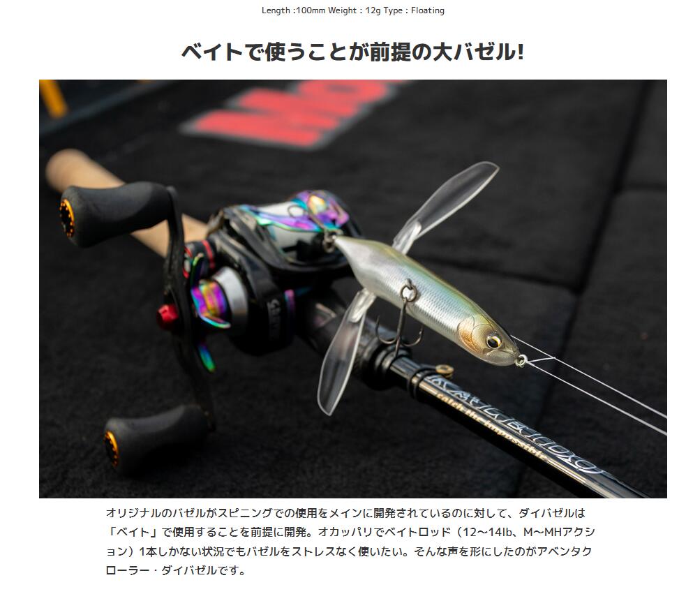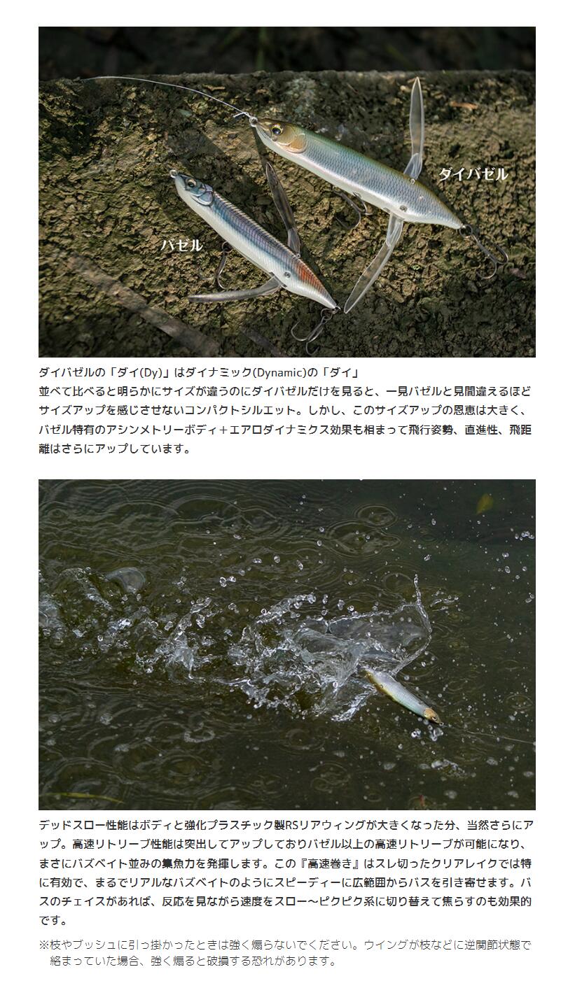 商品情報商品説明オリジナルのバゼルがスピニングでの使用をメインに開発されているのに対して、ダイバゼルは「ベイト」で使用することを前提に開発。オカッパリでベイトロッド(12~14lb、M~MHアクション)1本しかない状況でもバゼルをストレスなく使いたい。そんな声を形にしたのがアベンタクローラー・ダイバゼルです。ダイバゼルの「ダイ(Dy)」はダイナミック(Dynamic)の「ダイ」並べて比べると明らかにサイズが違うのにダイバゼルだけを見ると、一見バゼルと見間違えるほどサイズアップを感じさせないコンパクトシルエット。しかし、このサイズアップの恩恵は大きく、バゼル特有のアシンメトリーボディ+エアロダイナミクス効果も相まって飛行姿勢、直進性、飛距離はさらにアップしています。デッドスロー性能はボディと強化プラスチック製RSリアウィングが大きくなった分、当然さらにアップ。高速リトリーブ性能は突出してアップしておりバゼル以上の高速リトリーブが可能になり、まさにバズベイト並みの集魚力を発揮します。この『高速巻き』はスレ切ったクリアレイクでは特に有効で、まるでリアルなバズベイトのようにスピーディーに広範囲からバスを引き寄せます。バスのチェイスがあれば、反応を見ながら速度をスロー~ピクピク系に切り替えて焦らすのも効果的です。※枝やブッシュに引っ掛かったときは強く煽らないでください。ウイングが枝などに逆関節状態で絡まっていた場合、強く煽ると破損する恐れがあります。