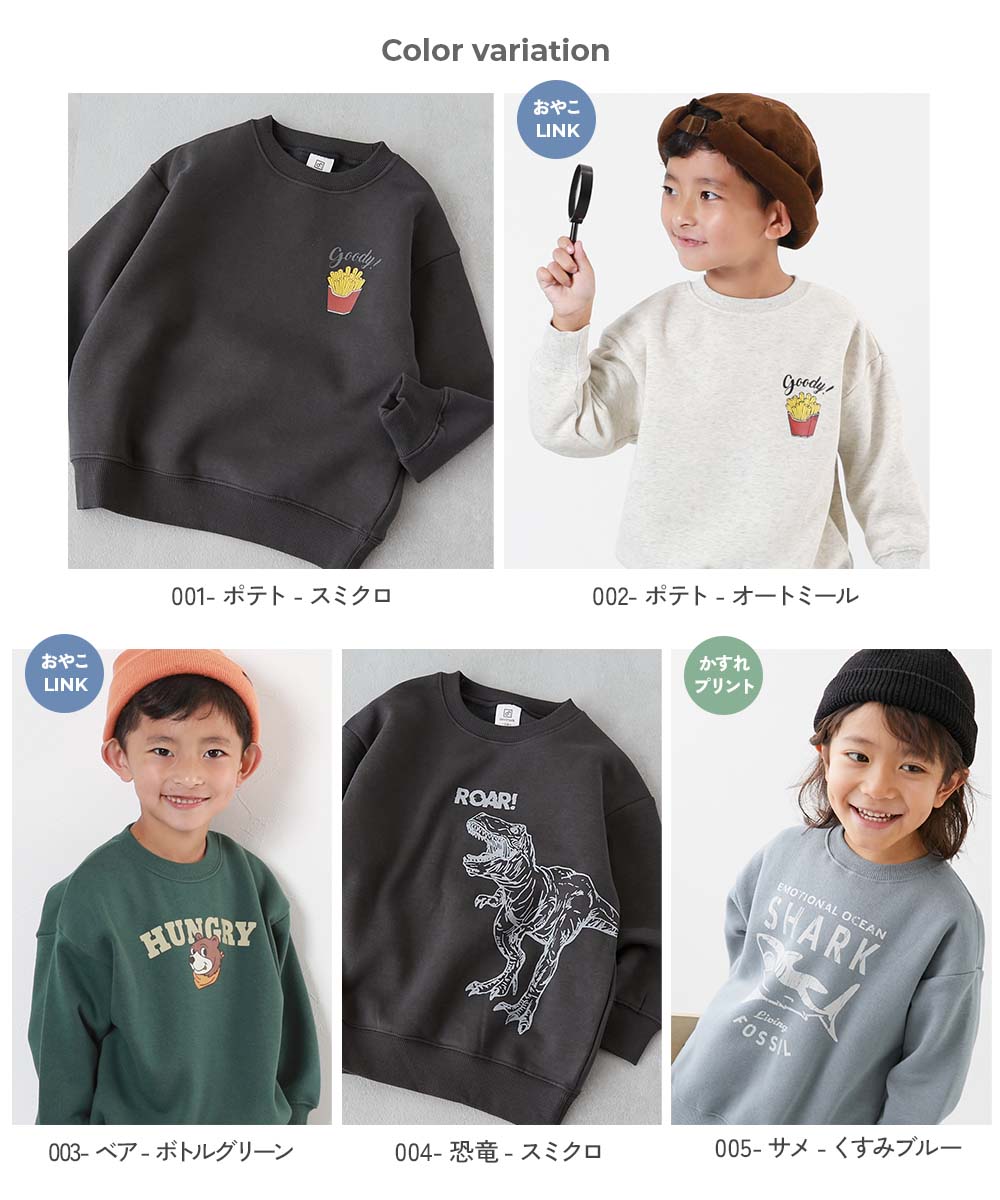 メーカー希望小売価格はメーカーサイトに基づいて掲載しています→こちら 掲載サイト→こちら 販売元情報→こちら 商品詳細 程よくゆるっとしたBOXシルエットのトレーナー。 どうぶつや食べ物デザインなど、遊び心のあるデザインを集めました。 ■シリーズ 一緒にえらぶって楽しい 今日はどんな服を着よう? 一緒に服をえらぶ時間は、親子の大切なひと時。 デザインやシルエット、素材など、バリエーション豊富に取り揃えたデビラボプリントシリーズなら、えらぶ楽しさがもっと広がる。 さあ、今日はどれをえらぶ? ■素材 ふっくらとした厚みが魅力的な、裏起毛素材 ふんわりと柔らかな肌ざわりが心地よい素材。 しっかり厚みがありながら、軽い着心地が特徴です。 肌寒い日でも温かく過ごせます。 伸縮性:ふつう ■スタイリング ジャストサイズでの着用はもちろん、あえてワンサイズ大きいものを選んでゆったり着るのもおすすめ。 トレンド感のあるボトムスを合わせれば、こなれ感のあるコーディネートに仕上がります。 サイズ/スペック サイズ 着丈 身幅 袖丈 肩幅 90cm 39 36 24 36 100cm 42 38 26.5 38 110cm 45 40 30.5 40 120cm 48.5 42 34.5 42 130cm 52 44 38.5 44 140cm 56 47 43 47 150cm 60 50 48.5 50 160cm 64 53 51 53 »サイズガイド ■素材・仕様 本体:綿55% ポリエステル45% / リブ:綿95% ポリウレタン5% ■生産国 CHINA ■仕様 洗濯方法 洗濯機洗い可(デリケート洗い) / 漂白剤使用不可 / 乾燥機使用不可 / 日陰つり干し/ 洗濯ネット使用 ご注意事項 ・摩擦や水、汗などで色が移ることがあります。ご注意ください。 ・平置きにて採寸しているため、サイズや形に多少の誤差が生じる場合がございます。あらかじめご了承ください。 ・生産時期により、多少色味が異なる場合がございますが、素材・サイズ等の品質に違いはございません。 ・ご使用のパソコンやブラウザの環境により、実際の色とは多少異なる場合がございます。 ご注意 予約商品と同時にご購入の商品は、 予約商品入荷後まとめて発送となります