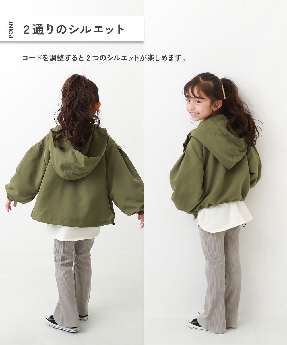 メーカー希望小売価格はメーカーサイトに基づいて掲載しています商品ページ→こちら掲載サイト→こちら販売元情報→こちら 商品詳細 ゆるっとしたシルエットに、袖と背中にタックを施したおしゃれなマウンテンパーカー。 シンプルなデザインなのでどんなアイテムとも合わせやすく、長いシーズン活用できる1枚です。 コードを調整すると2つのシルエットが楽しめます。 ■素材 表面に少し起毛をかけた、ポリエステルピーチ素材 桃の肌のようなふんわりとした肌ざわりが特徴。 表面にあまり光沢がなく、柔らかな印象を与えてくれます。 伸縮性:なし ■スタイリング パンツにも、スカートスタイルにも合わせやすいデザイン。 かっこよく着こなしたいときは、コードをゆるめてAラインシルエットに。 女の子らしく着こなしたいときは、コードをしめてバルーンシルエットで着用するのがおすすめです。 サイズ/スペック サイズ 着丈 身幅 袖丈 肩幅 100cm 41 44 31.5 35 110cm 44 47 36.5 38 120cm 47 50 40 41 130cm 50 53 43.5 44 140cm 54 57 46.5 48 150cm 58 61 49.5 52 160cm 61 65 52.5 56 »サイズガイド ■素材・仕様 ポリエステル100% ■生産国 CHINA ■仕様 洗濯方法 洗濯機洗い可(デリケート洗い) / 漂白剤使用不可 / 乾燥機使用不可 / 日陰つり干し/ 洗濯ネット使用 ご注意事項 ・平置きにて採寸しているため、サイズや形に多少の誤差が生じる場合がございます。あらかじめご了承ください。 ・摩擦や水、汗などで色が移ることがあります。ご注意ください。 ・素材の特性上、摩擦や洗濯により毛羽立ち、毛羽落ちが生じる恐れがあります。 ・生産時期により、多少色味が異なる場合がございますが、素材・サイズ等の品質に違いはございません。 ・ご使用のパソコンやブラウザの環境により、実際の色とは多少異なる場合がございます。