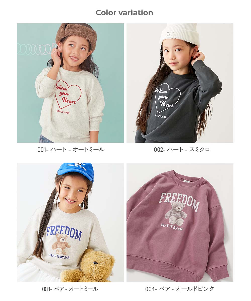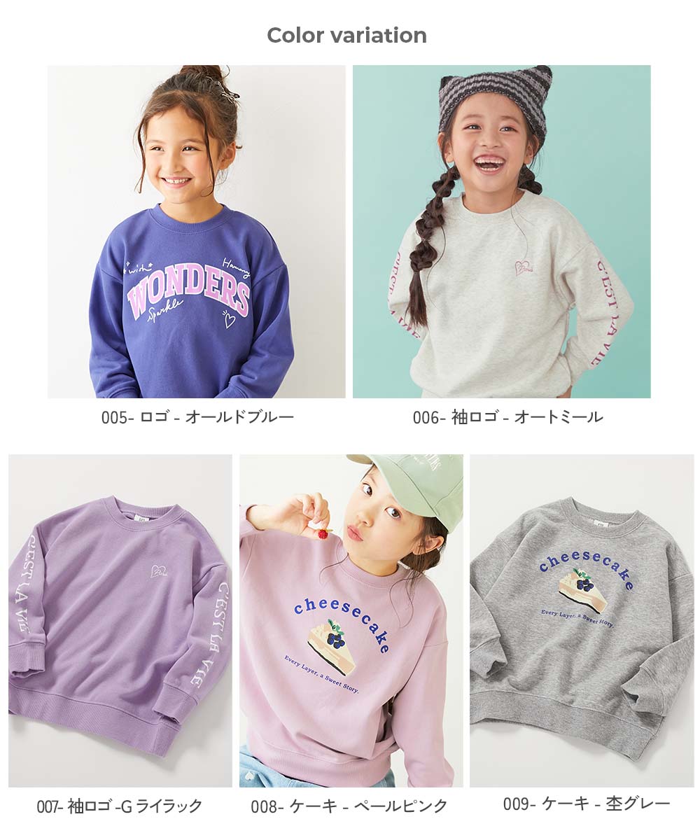 メーカー希望小売価格はメーカーサイトに基づいて掲載しています→こちら 掲載サイト→こちら 販売元情報→こちら 商品詳細 ゆったりとしたシルエットに、ストリート風のプリントデザインが魅力。 幅広いスタイリングが楽しめるアイテムです。 ■シリーズ 一緒にえらぶって楽しい 今日はどんな服を着よう? 一緒に服をえらぶ時間は、親子の大切なひと時。 デザインやシルエット、素材など、バリエーション豊富に取り揃えたデビラボプリントシリーズなら、えらぶ楽しさがもっと広がる。 さあ、今日はどれをえらぶ? ■素材 吸汗性が良く、程よい肉感が心地よいCVC裏毛 裏がパイル状になっているので、吸汗性が良く汗ばむ日でも快適な着心地。 程よく薄手の裏毛は、長いシーズン着まわしやすい素材です。 毛玉が出来にくいのも嬉しいポイント。 伸縮性:ふつう ■スタイリング トップスを主役に、パンツやスニーカーといったカジュアルなアイテムとのコーディネートがおすすめ。 いつものコーデに程よく甘さをプラスしてくれるアイテムです。 サイズ/スペック サイズ 着丈 身幅 袖丈 肩幅 90cm 39 36 24 36 100cm 42 38 26.5 38 110cm 45 40 30.5 40 120cm 48.5 42 34.5 42 130cm 52 44 38.5 44 140cm 56 47 43 47 150cm 60 50 48.5 50 160cm 64 53 51 53 »サイズガイド ■素材・仕様 本体:綿75% ポリエステル25% / リブ:綿95% ポリウレタン5% ■生産国 CHINA ■仕様 洗濯方法 洗濯機洗い可(デリケート洗い) / 漂白剤使用不可 / 乾燥機使用不可 / 日陰つり干し/ 洗濯ネット使用 / プリント部分アイロン禁止 ご注意事項 ・摩擦や水、汗などで色が移ることがあります。ご注意ください。 ・平置きにて採寸しているため、サイズや形に多少の誤差が生じる場合があります。あらかじめご了承ください。 ・生産時期により、多少色味が異なる場合がございますが、素材・サイズ等の品質に違いはございません。 ・ご使用のパソコンやブラウザの環境により、実際の色とは多少異なる場合がございます。