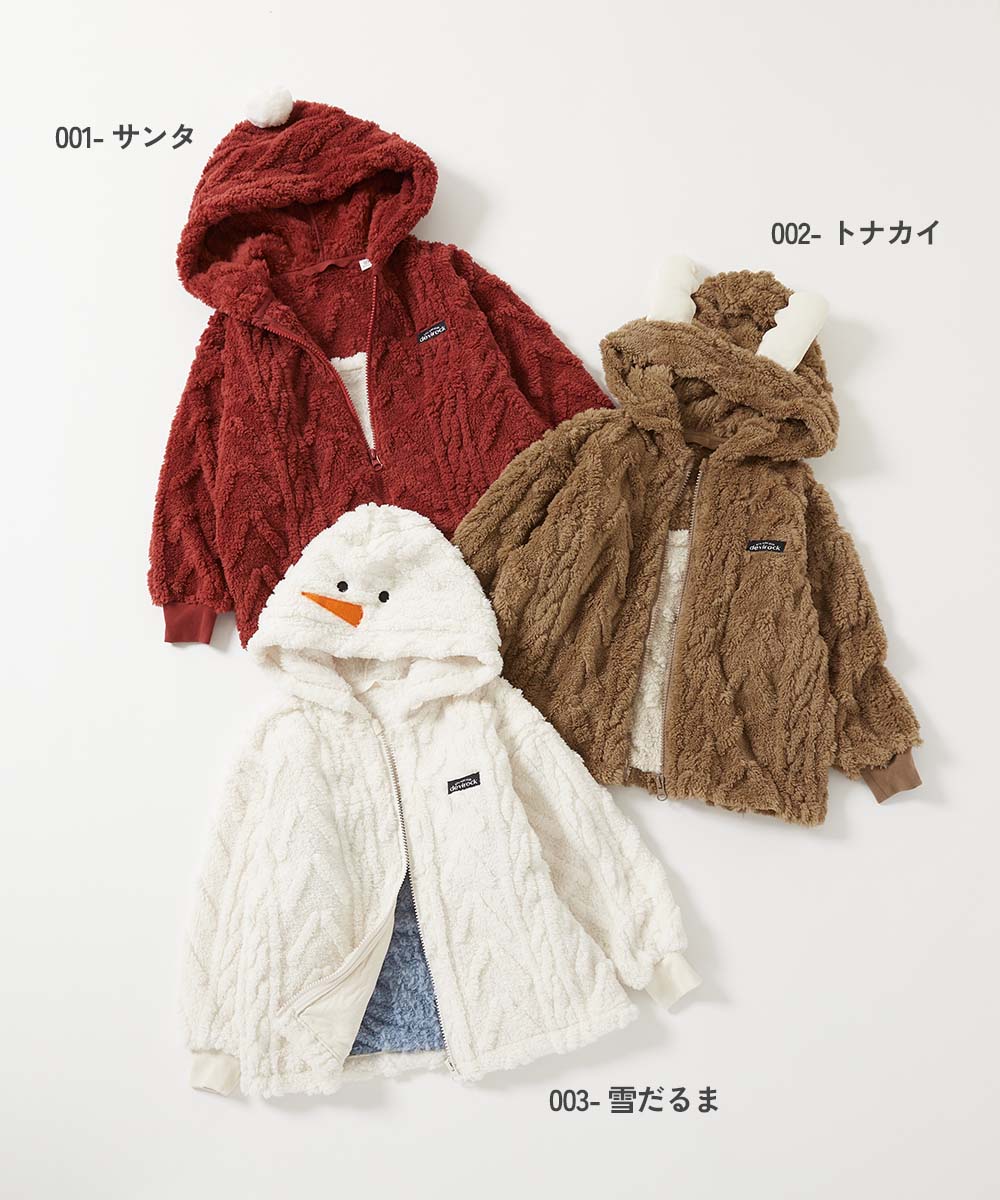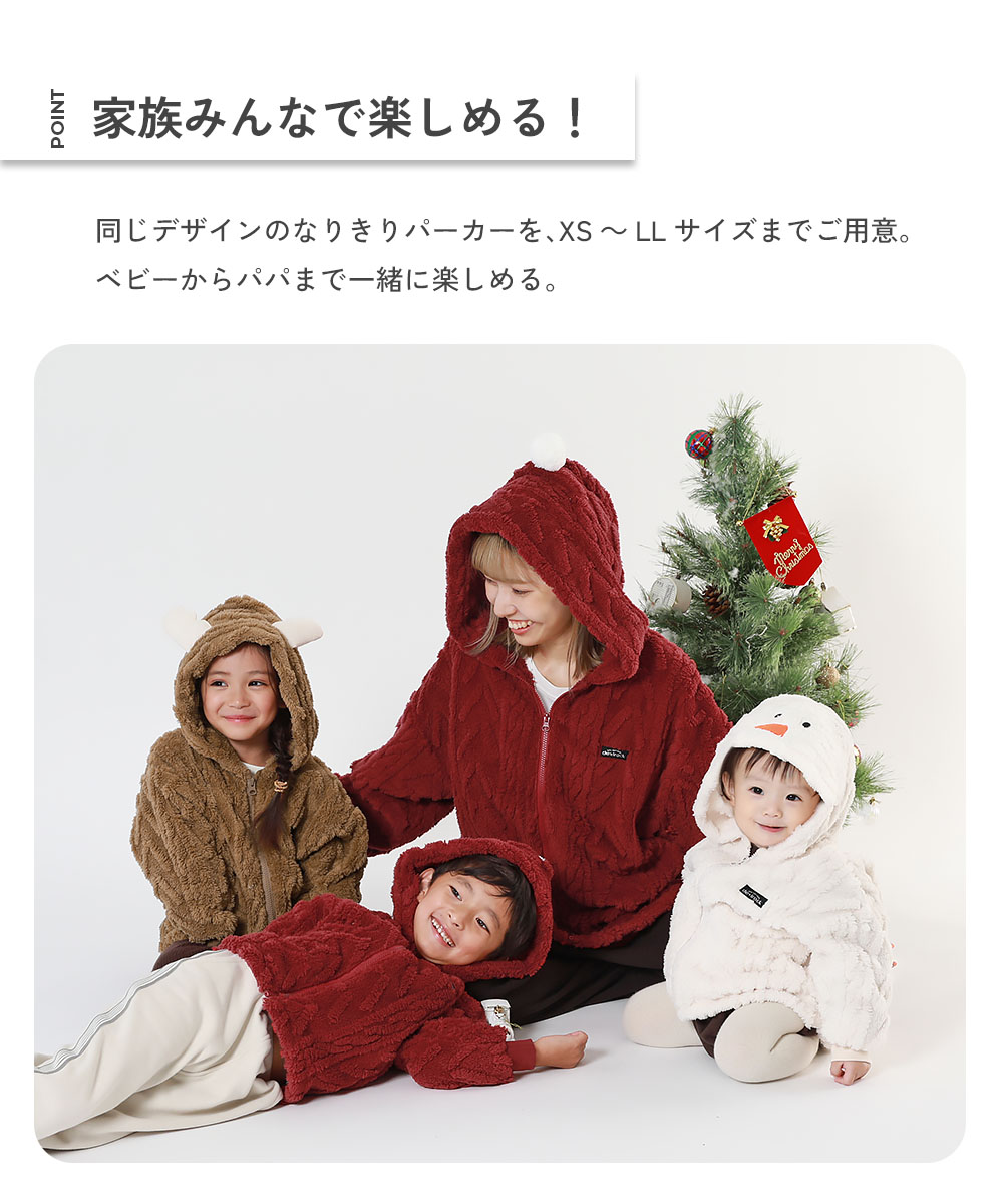 メーカー希望小売価格はメーカーサイトに基づいて掲載しています商品ページ→こちら掲載サイト→こちら販売元情報→こちら 商品詳細 家族で楽しむ『クリスマス なりきりパーカー』 街中がキラキラ輝き、サンタがソリに乗ってシャンシャンと近づいてきた! 今年のクリスマスはママ・パパも一緒に楽しんでみない? 思わず写真を撮りたくなるようなリンクコーデで、今年のホリデーシーズンはもっと楽しく、もっと親子に。 ■素材 ふんわりもこもこと、温かみのあるボア素材 柔らかな毛足が心地よい、ケーブル柄のボア素材。 ほっこりあたたかみのある見た目なので、秋冬にぴったりです。 伸縮性:ふつう サイズ/スペック サイズ 着丈 身幅 袖丈 肩幅 XS(80-90) 40 38 24.5 36 S(100-110) 46 42 33 40 M(120-130) 53 46 41 44 L(140-150) 61 52 51.5 50 LL(160-170) 67 61 56.5 59 »サイズガイド ■素材・仕様 本体:ポリエステル100% / その他:綿100% / リブ:綿95% ポリウレタン5% ■生産国 CHINA ■仕様 洗濯方法 洗濯機洗い可(デリケート洗い) / 漂白剤使用不可 / 乾燥機使用不可 / 日陰つり干し/ 洗濯ネット使用 ご注意事項 ・素材の特性上、摩擦や洗濯により毛羽立ち、毛羽落ちが生じる恐れがあります。 ・摩擦や水、汗などで色が移ることがあります。ご注意ください。 ・平置きにて採寸しているため、サイズや形に多少の誤差が生じる場合があります。あらかじめご了承ください。 ・生産時期により、多少色味が異なる場合がございますが、素材・サイズ等の品質に違いはございません。