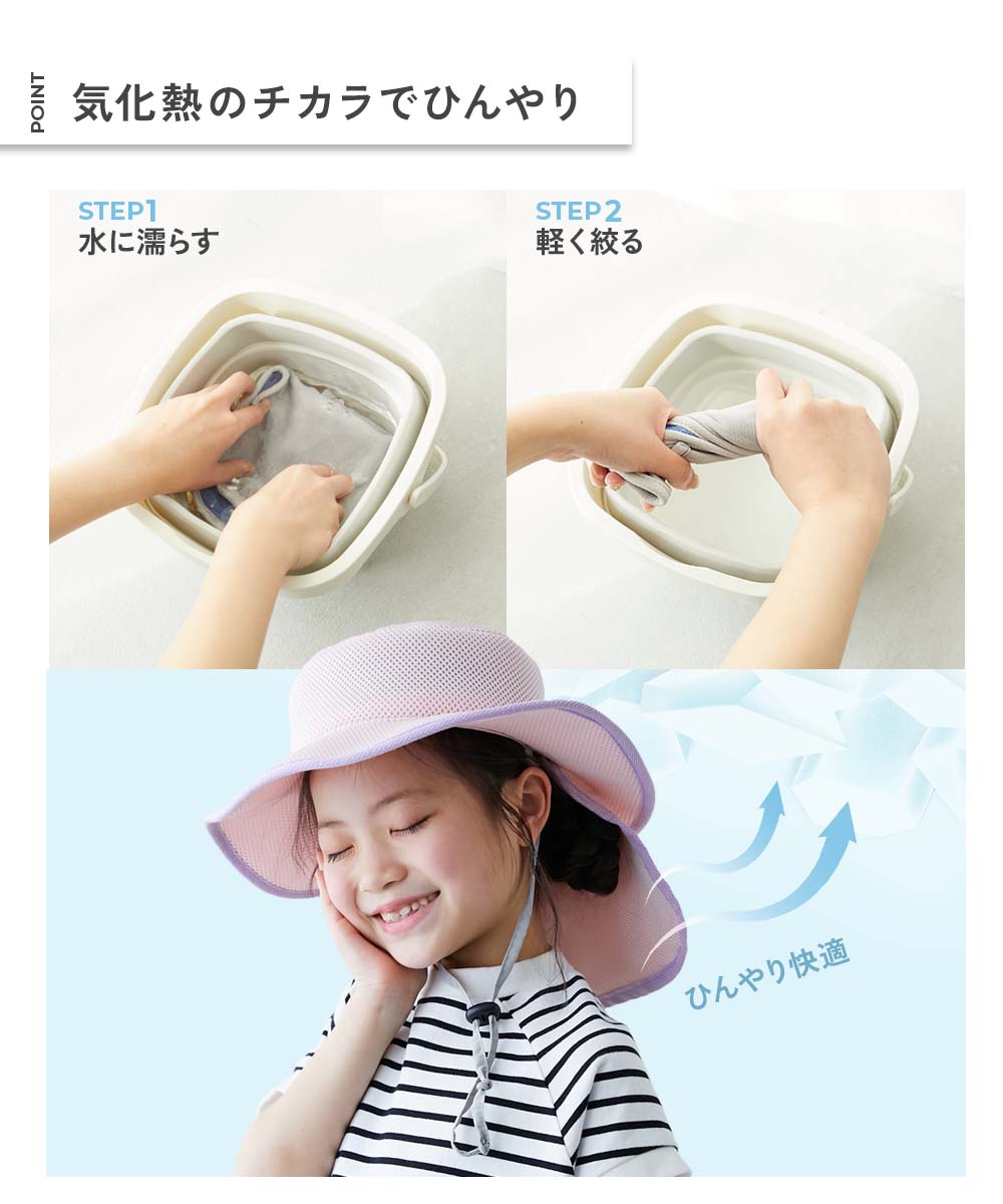 メーカー希望小売価格はメーカーサイトに基づいて掲載しています商品ページ→こちら掲載サイト→こちら販売元情報→こちら 商品詳細 水分が蒸発するとひんやりする素材(気化熱のチカラ)を使ったハットが登場。 濡らして使用すると猛暑対策として役立つアイテムです。 外せる日よけガードには、保冷剤を入れることができるのでさらに涼しく着用もできます。 耳まで隠れる長め設計もポイントです。 お子さまを見つけやすいカラーリングにもこだわりました。 サイズ/スペック サイズ 頭周り 高さ つばの長さ 紐の長さ 54 54 7.5 6.5 70 56 56 7.5 6.5 80 58 58 9.5 7 80 »サイズガイド ■素材・仕様 本体:ポリエステル100% / 別布:ポリエステル92% ポリウレタン8% ■生産国 CHINA ■仕様 洗濯方法 手洗い可 / 漂白剤使用不可 / 乾燥機使用不可 / 日陰つり干し ご注意事項 ・洗濯機の使用や、つけ置き洗いは避けてください。 ・摩擦や水、汗などで色が移ることがあります。ご注意ください。 ・平置きにて採寸しているため、サイズや形に多少の誤差が生じる場合があります。あらかじめご了承ください。 ・生産時期により、多少色味が異なる場合がございますが、素材・サイズ等の品質に違いはございません。