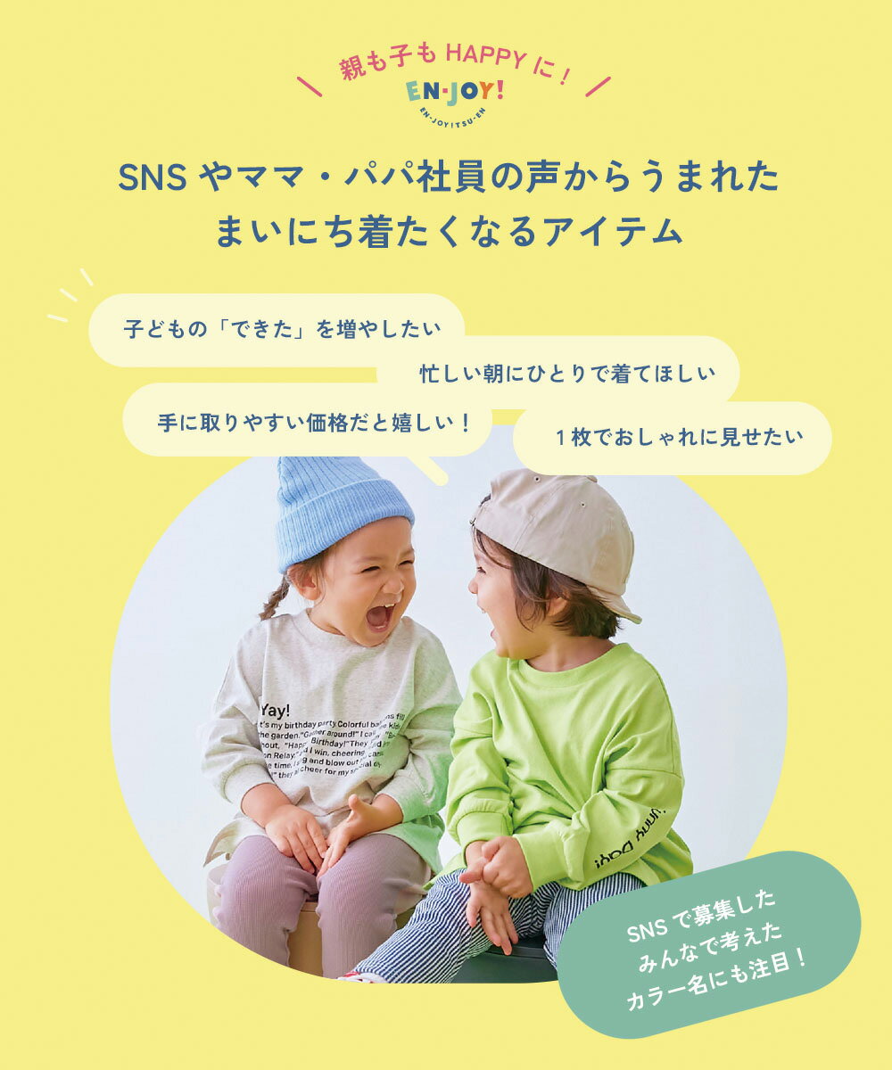 メーカー希望小売価格はメーカーサイトに基づいて掲載しています商品ページ→こちら掲載サイト→こちら販売元情報→こちら 商品詳細 親も子もHAPPYになれる! まいにち通園する子どもたちに向けた、devirockからの新しい提案"EN-JOY!TSU-EN"シリーズ。 「できた!」が自信になる服。 自分でえらんだ服を自分で着るまいにちを。 おやこに嬉しい5POINT ・前後どちらでも着られる 1人でお着替えしても、どっちも正解。ママ・パパも前後ろを気にせずさっと着せられる。 ・選べるプリント&カラー 好きが見つかる12柄。 ・程よく薄手の裏毛素材 吸汗性が良く汗ばむ日でも快適。 ・こだわりのシルエット ワンサイズアップで着てもかわいいシルエット。 ・嬉しい価格 気軽に買い足せる、手に取りやすい価格帯に。 ■シリーズ だいすきな色、お気に入りのもよう。 着ているだけで なんだかルンルンしてきた! 「じぶんでおきがえできた!」って ママやパパ、せんせいにも じまんできちゃう ぼくの、わたしの、たのしい通園がはじまる。 まいにち、EN-JOY! ■素材 吸汗性が良く、程よい肉感が心地よいCVC裏毛 裏がパイル状になっているので、吸汗性が良く汗ばむ日でも快適な着心地。 程よく薄手の裏毛は、長いシーズン着まわしやすい素材です。 毛玉が出来にくいのも嬉しいポイント。 伸縮性:ふつう ■スタイリング 毎日の通園コーデをPOPでHAPPYな印象に。 カラー×カラーやカラー×柄など、カラフルなコーディネートがおすすめ。 サイズ/スペック サイズ 着丈 身幅 袖丈 肩幅 80cm 36 34 21 34 90cm 39 36 24 36 100cm 42 38 26.5 38 110cm 45 40 30.5 40 120cm 48.5 42 34.5 42 130cm 52 44 38.5 44 »サイズガイド ■素材・仕様 本体:綿75% ポリエステル25% / リブ:綿95% ポリウレタン5% ■生産国 CHINA ■仕様 洗濯方法 洗濯機洗い可(デリケート洗い) / 漂白剤使用不可 / 乾燥機使用不可 / 日陰つり干し/ 洗濯ネット使用 / プリント部分アイロン禁止 ご注意事項 ・摩擦や水、汗などで色が移ることがあります。ご注意ください。 ・平置きにて採寸しているため、サイズや形に多少の誤差が生じる場合があります。あらかじめご了承ください。 ・生産時期により、多少色味が異なる場合がございますが、素材・サイズ等の品質に違いはございません。 ・ご使用のパソコンやブラウザの環境により、実際の色とは多少異なる場合がございます。
