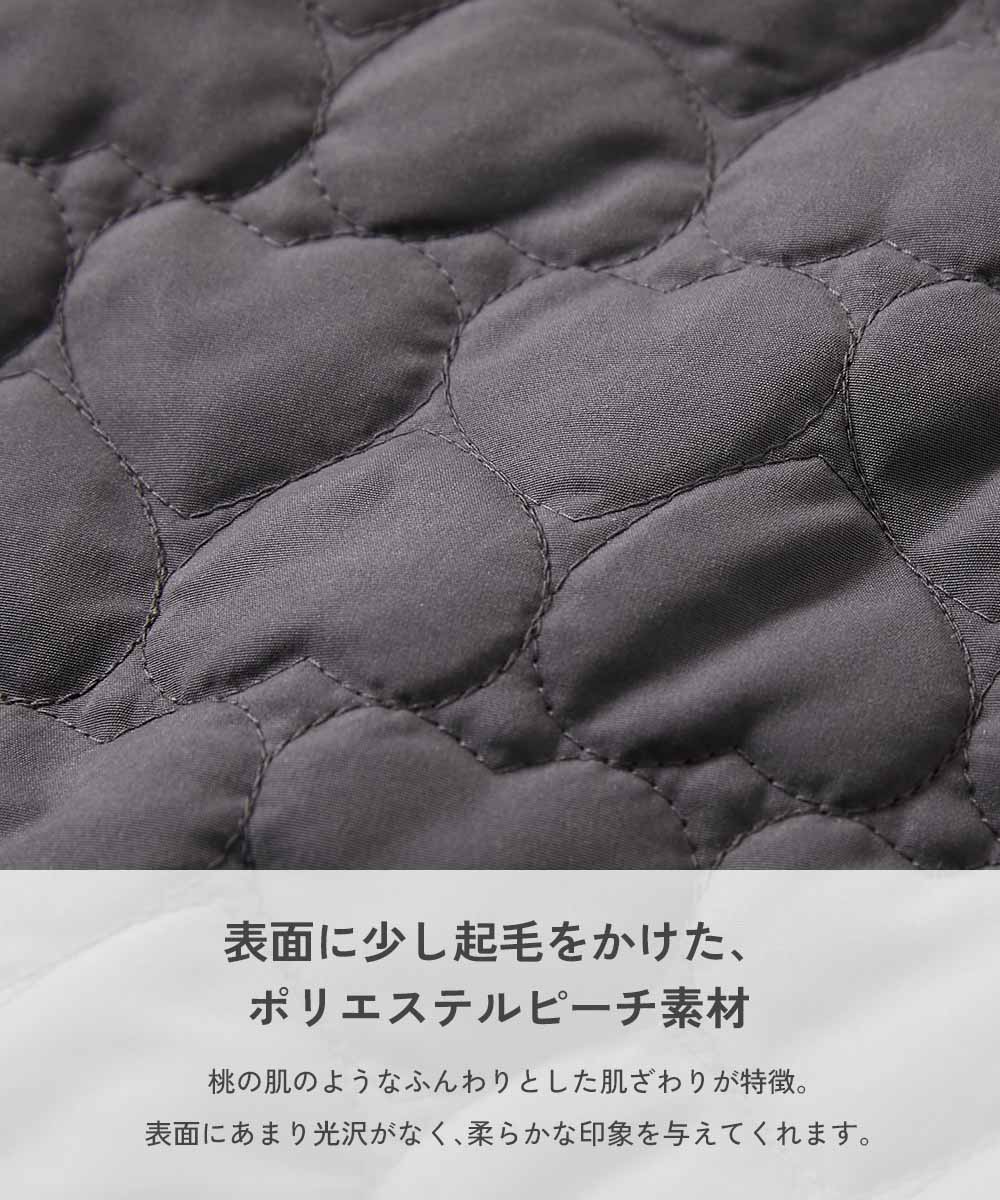 メーカー希望小売価格はメーカーサイトに基づいて掲載しています→こちら 掲載サイト→こちら 販売元情報→こちら 商品詳細 キルトがハート型になっているさりげなくかわいい1枚。 秋冬のコーデに女の子らしさをプラスしてくれるアイテムです。 ■素材 表面に少し起毛をかけた、ポリエステルピーチ素材 桃の肌のようなふんわりとした肌ざわりが特徴。 表面にあまり光沢がなく、柔らかな印象を与えてくれます。 伸縮性:なし ■スタイリング タイトなボトムスを合わせれば大人っぽい着こなしに。 ゆるっとしたアイテムとコーディネートすれば、トレンド感のある着こなしに。 合わせるアイテム次第で、様々なスタイリングを楽しめるアウターです。 サイズ/スペック サイズ 着丈 身幅 袖丈 肩幅 100cm 43 38 29.5 35 110cm 46 40 34.5 37 120cm 49 42 38.5 39 130cm 53 44 42.5 41 140cm 57 47 46.5 44 150cm 61 50 52 47 160cm 65 53 54.5 50 »サイズガイド ■素材・仕様 表地:ポリエステル100% / 中わた:ポリエステル100% / 裏地:ポリエステル100% ■生産国 CHINA ■仕様 洗濯方法 洗濯機洗い可(デリケート洗い) / 漂白剤使用不可 / 乾燥機使用不可 / 日陰つり干し/ 洗濯ネット使用 ご注意事項 ・素材の特性上、摩擦や洗濯により毛羽立ち、毛羽落ちが生じる恐れがあります。 ・摩擦や水、汗などで色が移ることがあります。ご注意ください。 ・平置きにて採寸しているため、サイズや形に多少の誤差が生じる場合があります。あらかじめご了承ください。 ・生産時期により、多少色味が異なる場合がございますが、素材・サイズ等の品質に違いはございません。 ・ご使用のパソコンやブラウザの環境により、実際の色とは多少異なる場合がございます。