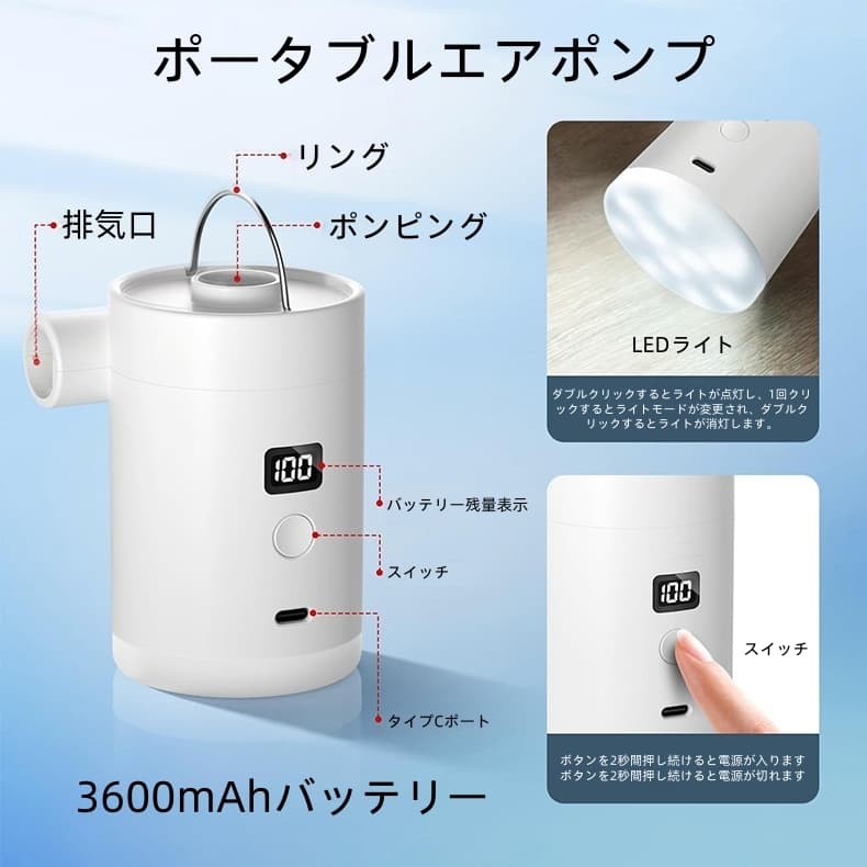 商品名:電動ポンプ 電動エアーポンプ 小型ポータブル空気入れ USB充電式 高速空気注入・排出対応 アウトドア キャンプ 浮き輪 プール用 エアマット対応 多機能LEDライト搭載 -商品説明- HASENの電動エアーポンプは、「空気入れ」「空気抜き」「LEDライト」の3つの機能が1台に集約された、アウトドアや日常使いに最適な多機能モデルです。 小型かつ軽量設計で、通勤・通学のカバンや旅行バッグにもスッキリ収納可能。キャンプやピクニック、海水浴、災害時の非常用としても活躍します。 エアーポンプの圧力は約3000Paに達し、浮き輪やゴムボート、エアーベッドをわずか数十秒で膨らませることが可能。最大1時間の連続使用ができ、複数のエア製品にも対応します。 エコフレンドリーなUSB Type-C充電方式を採用し、アウトドアでもモバイルバッテリーなどから簡単に充電が可能です。 また、過熱を検知すると自動で電源を遮断する「過熱保護機能」を搭載。安全性を重視し、お子様や高齢者の方でも安心してご使用いただけます。 高輝度LEDライト付きで、テント内や夜間作業にも便利。スタイリッシュなデザインと機能性を兼ね備えた、プレミアムなポータブルエアポンプです。 特徴 ・高出力3000Paで高速インフレーションを実現。 ・過熱保護機能付きで安心の使用感。 ・3600mAh大容量バッテリーで約1時間連続使用可能。 ・軽量・コンパクト設計で持ち運びに便利。 ・アウトドアや旅行、災害時にも対応。 仕様 ・サイズ:約高さ9cm × 直径5.5cm ・バッテリー容量:3600mAh ・充電方式:USB Type-C ・対応時間:約60分連続使用可 ・付属品:5種類ノズル、USB充電ケーブル ・カラー:ホワイト(他カラー記載なし) 機能 ・空気注入&空気排出両対応。 ・過熱時自動電源オフの保護設計。 ・4段階LEDライト(弱/中/強/SOS点滅)。 ・ノズル交換で様々な用途に対応(浮き輪、エアーベッド、真空袋など)。 使用・手入れについて ・電源ボタンを2秒間長押しで起動/停止します。 ・ノズルを対象物にしっかり取り付けて使用してください。 ・使用後は柔らかい布で拭いて清潔を保ってください。 ・水中では使用しないでください(防水機能なし)。 注意事項 ※商品の色はできる限り実物に近づけていますが、ディスプレイ設定や撮影条件により色味が異なる場合があります。ご了承ください。 当店関連キーワード 電動ポンプ 小型エアーポンプ アウトドア用空気入れ USB充電式電動空気入れ キャンプ用品 軽量エアポンプ 空気抜き兼用ポンプ 真空圧縮袋対応 携帯式インフレーターポンプ 浮き輪 プール ベッド ゴムボート用ポンプ LEDライト付き電動ポンプ商品名:電動ポンプ 電動エアーポンプ 小型ポータブル空気入れ USB充電式 高速空気注入・排出対応 アウトドア キャンプ 浮き輪 プール用 エアマット対応 多機能LEDライト搭載 -商品説明- HASENの電動エアーポンプは、「空気入れ」「空気抜き」「LEDライト」の3つの機能が1台に集約された、アウトドアや日常使いに最適な多機能モデルです。 小型かつ軽量設計で、通勤・通学のカバンや旅行バッグにもスッキリ収納可能。キャンプやピクニック、海水浴、災害時の非常用としても活躍します。 エアーポンプの圧力は約3000Paに達し、浮き輪やゴムボート、エアーベッドをわずか数十秒で膨らませることが可能。最大1時間の連続使用ができ、複数のエア製品にも対応します。 エコフレンドリーなUSB Type-C充電方式を採用し、アウトドアでもモバイルバッテリーなどから簡単に充電が可能です。 また、過熱を検知すると自動で電源を遮断する「過熱保護機能」を搭載。安全性を重視し、お子様や高齢者の方でも安心してご使用いただけます。 高輝度LEDライト付きで、テント内や夜間作業にも便利。スタイリッシュなデザインと機能性を兼ね備えた、プレミアムなポータブルエアポンプです。 特徴 ・高出力3000Paで高速インフレーションを実現。 ・過熱保護機能付きで安心の使用感。 ・3600mAh大容量バッテリーで約1時間連続使用可能。 ・軽量・コンパクト設計で持ち運びに便利。 ・アウトドアや旅行、災害時にも対応。 仕様 ・サイズ:約高さ9cm × 直径5.5cm ・バッテリー容量:3600mAh ・充電方式:USB Type-C ・対応時間:約60分連続使用可 ・付属品:5種類ノズル、USB充電ケーブル ・カラー:ホワイト(他カラー記載なし) 機能 ・空気注入&空気排出両対応。 ・過熱時自動電源オフの保護設計。 ・4段階LEDライト(弱/中/強/SOS点滅)。 ・ノズル交換で様々な用途に対応(浮き輪、エアーベッド、真空袋など)。 使用・手入れについて ・電源ボタンを2秒間長押しで起動/停止します。 ・ノズルを対象物にしっかり取り付けて使用してください。 ・使用後は柔らかい布で拭いて清潔を保ってください。 ・水中では使用しないでください(防水機能なし)。 注意事項 ※商品の色はできる限り実物に近づけていますが、ディスプレイ設定や撮影条件により色味が異なる場合があります。ご了承ください。 当店関連キーワード 電動ポンプ 小型エアーポンプ 