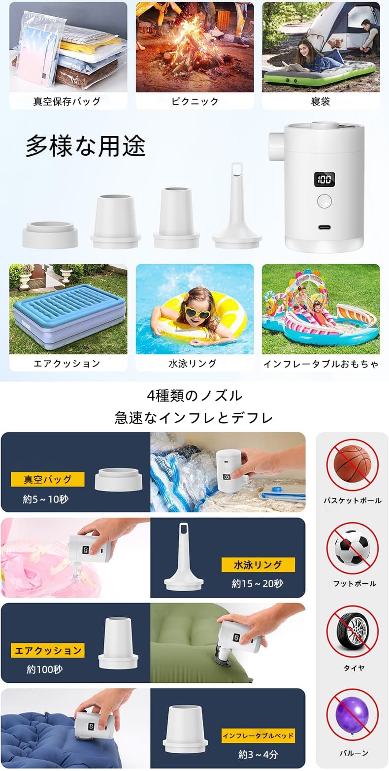 電動空気入れ 空気抜き 両対応 電動ポンプ 電動エアーポンプ 過熱保護 増圧機能 ライト付き 高速充填 超軽量 USB充電式 携帯式エアーポンプ 小型 インフレーターマット 浮き輪 プール ゴムボート エアベット ビニールブール 真空圧縮袋適用 5種類ノズル付き