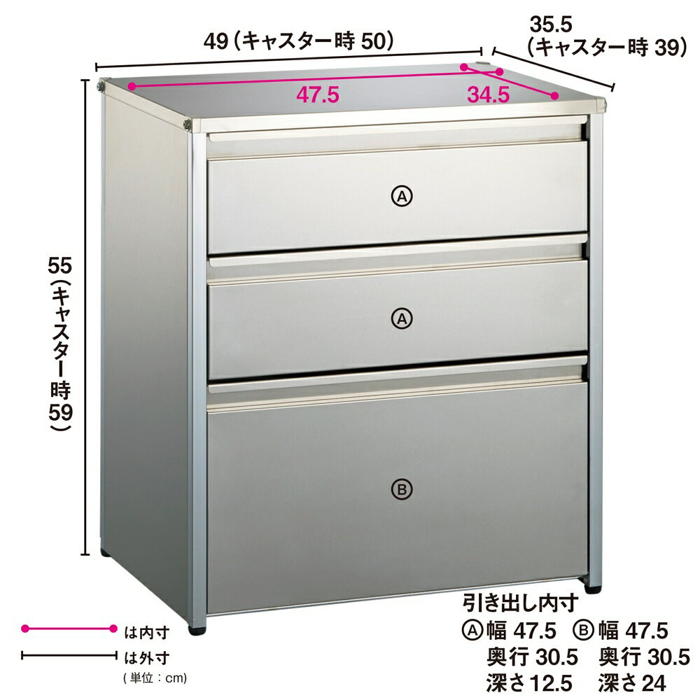 水はねや汚れに強いステンレス製の引出収納のワイドタイプシンク下にぴったりと収まり、空きスペースを有効活用できます。ヘアライン風のマットな仕上がりのステンレスはクールな印象。シンク横に置けば、天板を作業台としても使えます。脚部はアジャスターとキャスターの2WAY仕様。アジャスターは床のガタツキにあわせて無段階で調節でき、移動がラクなキャスターはストッパー付きで固定もできます。ステンレスの特徴について■耐久性・・・ステンレス鋼は非常に耐久性が高く、錆びにくい材料です。これにより、長期間にわたって使用できるため、特に湿気の多い環境や頻繁に使用する場所に適しています。■お手入れが簡単・・・ステンレスは表面が滑らかで、汚れが付着しにくく、また簡単に拭き取ることができます。これにより、清掃が非常に楽になります。■洗練されたデザイン性・・・ステンレスのシルバーの光沢は、現代的でクリーンな印象を与えます。どんなインテリアにも合わせやすく、スタイリッシュなデザインが特徴です。ページ下部に画像の説明がございます。一部別売りの商品もございますので、説明分ご確認のうえご注文ください。>画像の説明はこちら<画像の説明引き出しが3段ついたワゴン。シンク下にぴったり収まります。詳細サイズマットな仕上がりのステンレスはクールな印象。裏側もフラットに美しく仕上げました。 ※写真のキャスターは旧タイプです。たっぷりした収納力で調味料の大きなボトルも収まります。 ※写真のキャスターは旧タイプです。ステンレスは指紋や水の跡が目立たないヘアライン仕上げ。 ※写真のキャスターは旧タイプです。引き出しももちろんステンレスでお手入れしやすい設計。【キャスターが新しくなりました!】アルミダイキャスト素材を使用。丈夫で長持ちします。ハンドルは横に長く持ちやすいF字型タイプを採用しました。引き出しは滑らかに開閉するレールを採用しています。 ※写真のキャスターは旧タイプです。下段の引き出しは深めで、500mlのペットボトルや鍋が立てて収納できます。 ※写真のキャスターは旧タイプです。使用イメージ仕様・サイズ■サイズ:幅49cm(キャスター時50cm)奥行35.5cm(キャスター時39cm)高さ55cm(キャスター時59cm)■引き出し奥行30.5cm■本体…ステンレス■日本製【取り付け時間約20分】【送料マーク:B】この商品の販売価格には配送料2500円(税込)が含まれています。この商品は下記のサービスが選択できます。※組み立て・開梱サービスは日時指定ができません。お届け前に配送所より配達日時のご連絡をさせていただきます。※別途配送料金がかかります。有料組み立てサービス※開梱サービス付きについて