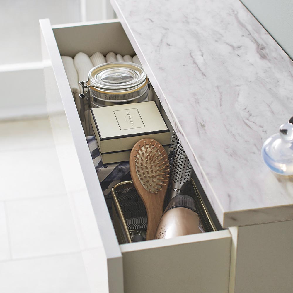 余裕のないサニタリーでも大丈夫。奥行きわずか25cmのストッカーがあきらめていた収納の悩みをすっきり解決します。前面はつややかな塗装仕上げで、天板は大理石調メラミンの高級感溢れるサニタリー収納。熱や水に強く耐久性のあるメラミン天板だからチェストの上にメイク用品やドライヤー等を置いても安心。奥行は薄型の25cm!スリムなのに頼れる収納力●狭いサニタリーや洗面所、洗濯機周りで活躍するスリムな薄型収納です。●歯ブラシなどの洗面台周りの小物ストックは引き出しへ。●全段引き出し収納タイプだから、ボディソープや洗剤のストックや化粧水、ヘアケアグッズ、フェイスタオルやバスタオルなどの生活感のあふれる日用品を目隠ししながら分別収納できます。リッチでお洒落な表情の石目調天板●大理石調メラミン素材は最新のシステムキッチンにも使用されている人気素材です。●その魅力は「水に強い」「汚れに強い」「熱に強い」。●洗面化粧台や洗濯機まわりの洗剤や化粧品などがこぼれても問題ありません。●熱にも強いのでヘアアイロンを直接置いても大丈夫です。引き出し内部は化粧仕上げ●引き出しの内部はすべて化粧仕上げなので衣類やタオルを収納しても安心です。●収納場所に困るタオル収納にぴったりです。●お風呂上りの脱衣所の衣類収納としてもおすすめです。洗面所はもちろんキッチン収納でも使えるストッカーです●熱や水に強く耐久性のあるメラミン天板なので水回りの収納やダイニングキッチンでも使用できます。●前板は、汚れてもサッと拭き取れる光沢感のある仕上げです。●日本の住環境に、生活スタイルに合わせやすい機能美ストッカーです。安心と信頼の職人技が光る国産の収納家具熟練の家具職人がひとつずつ丁寧に仕上げたワンランク上の日本製サニタリーストッカーです。細部の丁寧な仕上がりなど日本製の高品質なランドリーラック・サニタリー収納で快適な暮らしを。届いたらすぐ使えるのが嬉しい完成品本体は組立不要。届いたらすぐ使えるのが嬉しい完成品でお届けします。ページ下部に画像の説明がございます。一部別売りの商品もございますので、説明文ご確認のうえご注文ください。>画像の説明はこちら<仕様・サイズ■サイズ:幅75cm奥行25cm高さ90cm、引き出し奥行17cm■天板耐荷重:約5kg■素材:前面…MDF(ウレタン塗装)、天板…メラミン化粧合板、側面…化粧合板■日本製【送料マーク:D】 梱包サイズが大きいため、お部屋まで搬入できない場合があります。ご注文の際は、必ず事前に梱包サイズと設置場所までの搬入導線(通路の幅・高さ等)をご確認ください。>詳細な説明はこちら<この商品の配送料は5000円(税込)です。※北海道・九州・沖縄は地域特別配送料がかかります。この商品は下記のサービスが選択できます。※組み立て・開梱サービスは日時指定ができません。お届け前に配送所より配達日時のご連絡をさせていただきます。※別途配送料金がかかります。有料開梱サービスについて 画像の説明オープン時歯ブラシなどの洗面台周りの小物ストックは引き出しへ。熱や水に強く耐久性のあるメラミン天板だからチェストの上にメイク用品やドライヤー等を置いても安心。安定感のある足回り引き出しの内部はすべて化粧仕上げなので衣類やタオルを収納しても安心です。引き出しには落下防止のストッパー付き。背面側面引き出しの内部も化粧仕上げ。
