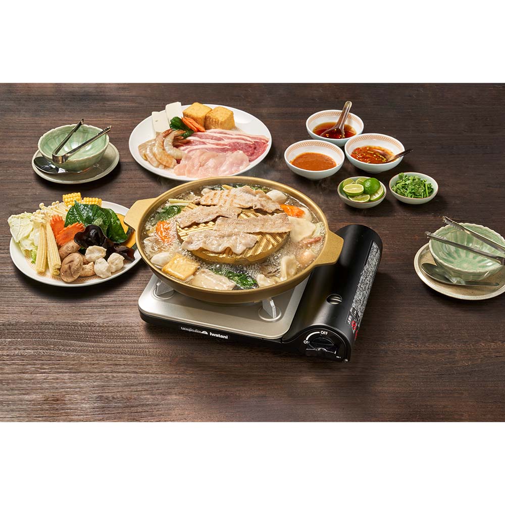 焼きと鍋が一緒にできる夢のようなプレ—トです♪鍋の内側中央のドーム部分で焼き料理、外側の鍋部分で鍋料理を楽しんでいただけます。焼き部分で肉やシーフードを焼き、焼かれた肉汁やシーフードの旨味が鍋部分に落ち、そこで旨みいっぱいの鍋を楽しむことができます。焼けば焼くほど旨味が凝縮された鍋を楽しんでいただけます♪※鍋単体の販売となります。カセットコンロは付属しません。イワタニカセットフーシリーズのカセットコンロにのせてご使用ください。使用できるコンロ一覧は写真8枚目にございます。話題のタイ料理ムーガタが楽しめる!ムーガタとは、タイ式焼肉+しゃぶしゃぶ鍋のことで、焼肉と鍋が一緒に楽しめる現地でも大人気の料理です。タイで使用されているムーガタ専用鍋を参考にして、本品は開発されました。本場のムーガタ鍋も同じような形状をしており、内側のドーム型の部分で肉やシーフードなどをじっくりと焼き、外側のくぼみ部分で野菜や豆腐、練り物などをスープでぐつぐつと煮込んでいただく料理です。ムーガタのおいしいポイントは、ドーム型で焼かれた肉汁やシーフードの旨味が、鍋部分にこぼれ落ちることでうま味がギュッとつまった鍋を楽しむことができること!ちなみにタイ語では、ムーは「豚」、ガタ」は「浅い鍋」という意味です。ムーガタだけでなく色々な料理が楽しめます鍋部分は鍋料理だけでなく、野菜を焼いてジンギスカンも楽しんでいただくこともできます。他にも●焼き肉&しゃぶしゃぶ●焼き海鮮鍋●炙りすぎ焼き鍋●塩もつ焼き&しょうゆモツ鍋●焼きチーズプルコギ●ジンギスカン見た目も映える金色の鍋見たものインパクトも大!目でも楽しめるゴールドカラでテンションも上がります。ホームパーティーはもちろん、アウトドアでも使えるのでキャンプでも大活躍。夏は焼き肉、冬では鍋で身体も温まりますよ!セパレート設計で美味しい&お手入れ簡単焼き部分と鍋部分がセパレート仕様にすることで「焼き」と「鍋」に適した温度になる設計。だから同時に調理しても美味しく出来上がるんです。また本体はフッ素樹脂加工のためお手入れが簡単です。※イワタニのカセットフーシリーズのコンロの五徳にはまる設計で、プレートがずれず、調理をより安全に行うことができます。詳しくは写真18枚にあるリストをご覧ください。※鍋単体の販売となります。カセットコンロは付属しません。本製品はイワタニカセットフーシリーズのカセットこんろ専用です。●ディノスで販売しているビストロの達人3とアモルフォプレミアムでもご使用いただけます。ディノスで販売している以下の商品では使用できません。イワタニプロたこマルチ、イワタニスモークレスグリル、ビストロの達人ジュニア、ミニマルS●他社メーカーのカセットコンロには脚がキッチリのらないのでご使用できません。●使用できる一覧は写真8枚目にあるリストをご覧ください。ページ下部に画像の説明がございます。一部別売りの商品もございますので、説明文ご確認のうえご注文ください。>画像の説明はこちら<仕様・サイズ■サイズ: (約)幅340×奥行295×高さ86.3mm・重量813g■素材:本体…アルミニウム合金、表面…フッ素樹脂加工、裏面…焼付塗装■中国製※鍋単体の販売となります。カセットコンロは付属しません。本製品はイワタニカセットフーシリーズのカセットこんろ専用です。【送料マーク:A】 この商品の販売価格には配送料880円(税込)が含まれています。 画像の説明お届けするのは金色の鍋のみです。カセットコンロは別売りです。市販のイワタニカセットフーシリーズと一緒にご使用ください。話題のタイ料理ムーガタイワタニカセットフーシリーズでご使用いただけます。ビストロの達人3でも使用OK! お届けは金色のプレートのみですイワタニカセットフーシリーズでご使用ください。脚がキッチリフィットします。。イワタニカセットフーシリーズでご使用ください。脚がキッチリフィットします。イワタニカセットフーシリーズでご使用ください。脚がキッチリフィットします。お届するのはこちらのみです。焼くドーム部分は取り外せます焼くドーム部分は取り外して洗えます焼いた美味しい出汁の入った鍋でしゃぶしゃぶ!焼いた美味しい出汁の入った鍋でしゃぶしゃぶ!ジンギスカン焼きチーズプルコギ使用できるイワタニ製品一覧話題のムーガタ炙りすき焼き鍋焼き海鮮鍋