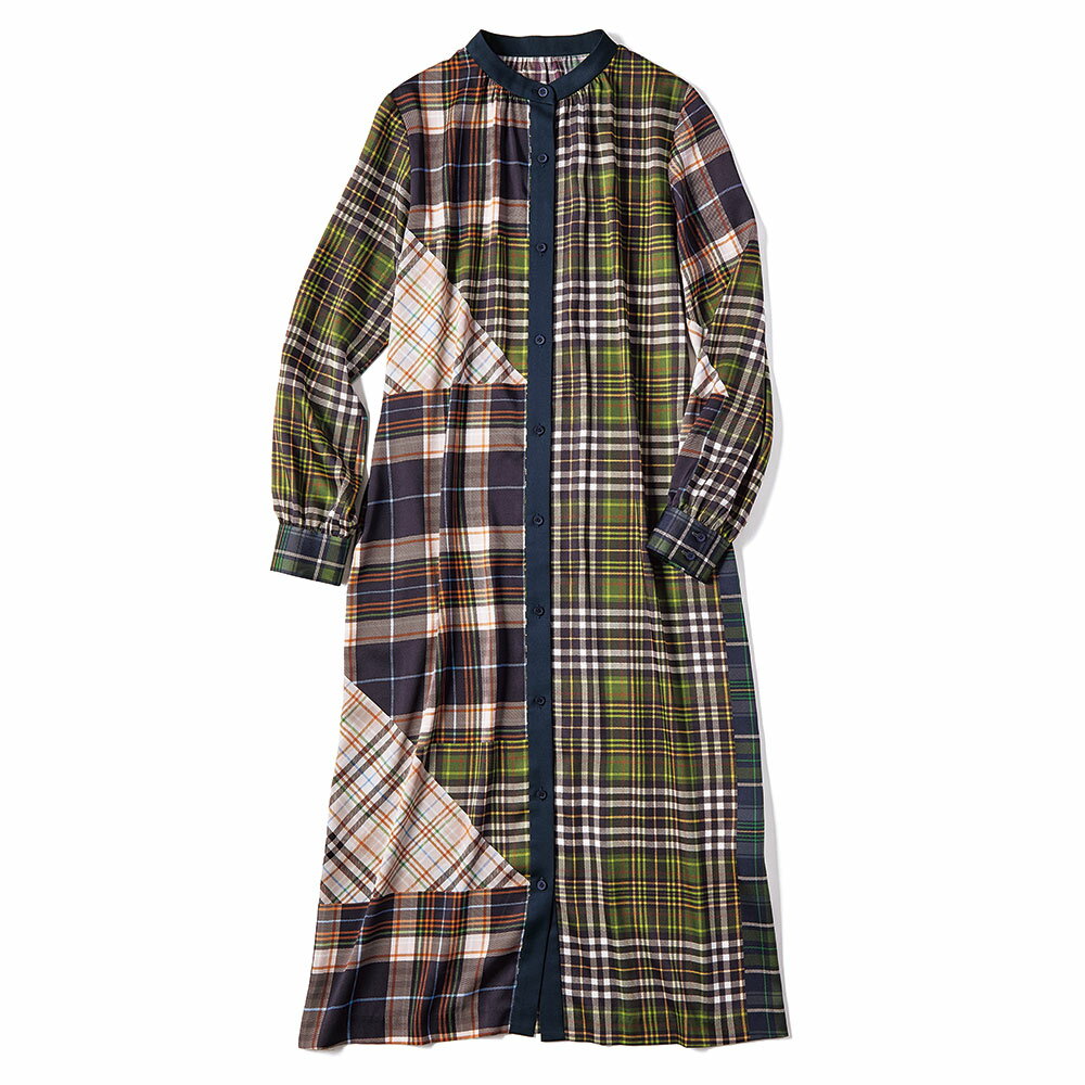 冬の旅に寄り添うスタイル。年末年始の帰省や温泉、ウィンタースポーツなど、冬の予定が気になる頃。印象的な素材感、色・柄の服を選んで、イベントをより輝かせて!エッジの効いたチェック柄でカジュアル上手に。一枚で着たり、インナーを重ねたり、羽織ったり。季節に合わせて着こなしを楽しめ、モードな存在感を放つシャツワンピースがあれば、日常でも旅行でもお洒落に自信が持てるはず。ほのかな光沢感とドレープ性が柄に表情を与えるポリエステルツイルのプリント生地は、イタリア「ERICA」社らしいファッショナブルな新作。数種類のチェック柄がコラージュされたデザインが、柄行きと配色の絶妙なバランスで品良くまとめ上げられています。柄が個性的な分、形はシンプルに徹して着こなしやすく。ネックラインと前立てに配した無地ネイビーがシャープな引き締め役です。≫ POINTアシンメトリーな配置、グリーン系にきれい色を効かせた洗練配色は、さすが「ERICA」社。ページ下部に画像の説明がございます。一部別売りの商品もございますので、説明文ご確認のうえご注文ください。>画像の説明はこちら<仕様・サイズこの商品はセール品のため返品できません■色:グリーン系■素材:本体…ポリエステル100%、別布(前立て・襟部分)…ポリエステル100%■前中心ボタン開き■両脇2個ポケット付き■原産国:中国製(生地はイタリア製)■商品により、柄の出方が多少異なります。◆サイズ(cm)【7】バスト 104バスト(適応) 80着丈 113肩幅 37袖丈 57ウエスト(適応) 61ヒップ(適応) 89【9】バスト 108バスト(適応) 83着丈 115肩幅 38袖丈 58ウエスト(適応) 64ヒップ(適応) 91【11】バスト 112バスト(適応) 86着丈 115肩幅 39袖丈 58ウエスト(適応) 67ヒップ(適応) 93【13】バスト 116バスト(適応) 89着丈 117肩幅 40袖丈 59ウエスト(適応) 70ヒップ(適応) 95【15】バスト 120バスト(適応) 92着丈 117肩幅 41袖丈 59ウエスト(適応) 73ヒップ(適応) 97【送料マーク:A】 この商品の販売価格には配送料880円(税込)が含まれています。 画像の説明コーディネート例frontback