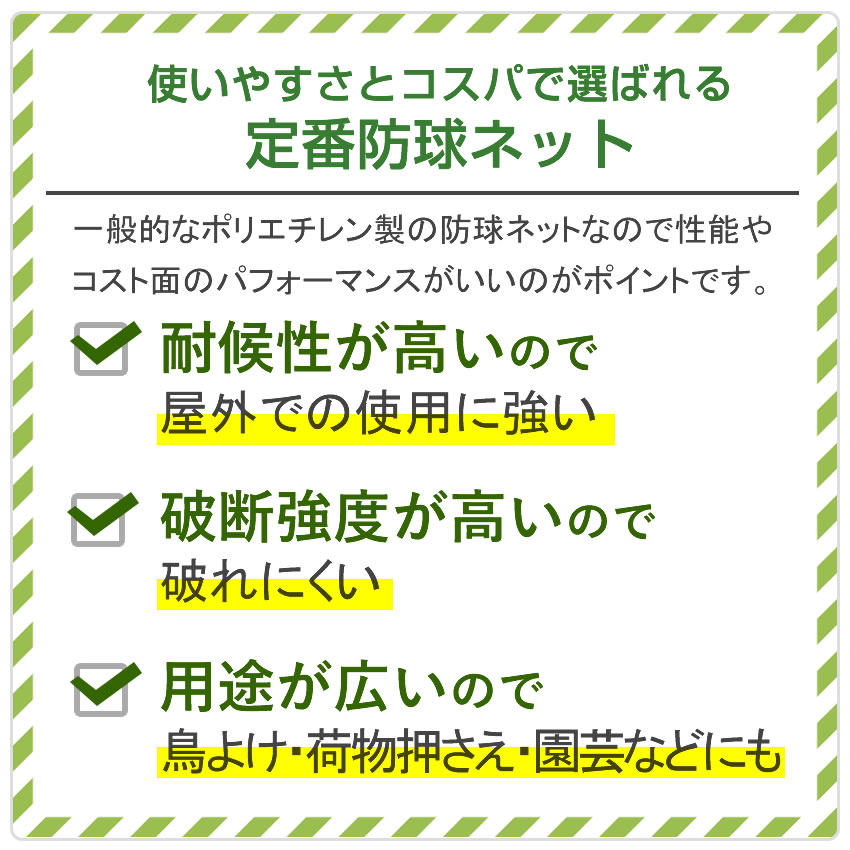 ※代金引換(着払い)不可 ・この製品は「代金引換(着払い)」はご利用いただけません。 ・お支払は「クレジットカード」「電子マネー」「コンビニ払い」「銀行振り込み」からお選びください。 ※※ご注意※※ ・決済時は「着払い」が選択可能ですが、お選びいただいても発送できません。その場合は改めてメールにてご連絡させていただきますので、別のお支払方法をお選びください。 ・いずれの決済方法でも運送便、およびお届け時間の指定はできません。 ・電子マネー、コンビニ払い、お振込の場合はご入金後の商品手配になります。 ・詳細は「お支払について」をご参照ください。 ※恐れ入りますが、お届け時間の時間指定はできません。 ※365日注文可能、出荷・各種問い合わせ対応は平日営業日となります。 ※表示納期にかかわらず、休業日や在庫状況などにより納期が変動する事があります。 目合い(約)25mm サイズ(約)幅1m×長さ30m 色 白 材質ポリエチレン製 原産国中国 ●スポーツ・防球用、簡易フェンス、鳥よけ、防獣など、様々な用途へご利用いただける約25mm目の丈夫な有結ネット。●屋外でも数年にわたりお使いいただく事ができます。●別売りの「ジョイントセット」を使うとネットを縫い合わせたり、周囲にロープや棒を縫い込むなどの加工をすることができます。●カットしてもほつれない、使いやすいネットです。※スポーツ用ネットとしてご利用の場合のご注意※・ゴルフネットとしてご利用の場合は25mm目以下のネットを使用しても打球が網目を突き抜ける可能性があります。このため、より目の細かい網やシートを重ねて張るなど、状況に応じて必要な対策をしてからご利用ください。・その他の場合でもネットのスソや縫い合わせ部分からのボールの飛び出し、ネットを取り付けた枠や支柱に当たって跳ね返った球による打球事故等が報告されています。ご利用にあたっては、ネットの取付状態、ネット自体の強度や劣化の状態などに十分ご注意の上、お客様ご自身で安全を確認の上ご利用ください。※その他ご注意※・網目に直接ヒモなどを通すと網目がほつれる可能性があります。・人や重量物をささえる用途にはご利用になれません。・ご利用年数は、ご利用の環境、用途、取付け方法などにより大きく異なります。 ◆防球ネット ロール巻・他◆ 防球ネット 約25mm目 1mx30m 茶 防球ネット 約25mm目 1mx30m 緑 防球ネット 約25mm目 1mx30m 白 防球ネット 約25mm目 1mx30m 黒 防球ネット 約25mm目 2mx30m 白(シングル巻) 防球ネット 約25mm目 2mx30m 黒(シングル巻) 防球ネット 約25mm目 2mx30m 緑(シングル巻) 防球ネット 約25mm目 2mx30m 緑(ダブル巻) 防球ネット 約37.5mm目 1mx30m 緑 防球ネット 約37.5mm目 2mx30m 緑(シングル巻) バッティングケージ「全球入魂」 3mx3mx3m 緑 25mm目 ◆フリーネット(屋内専用)ロール巻◆ フリーネット 25mm角目 1m×30m 白 フリーネット 25mm角目 1mx30m オレンジ フリーネット 25mm角目 1mx30m 黄色 フリーネット 50mm角目 1mx30m 白 ◆ホームネット(DIY・工作用パック品)一覧◆ ホ-ムネット 25mm グリーン 1m×3m ホ-ムネット 25mm グリーン 1m×2m ホ-ムネット 25mm グリーン 2m×3m ホ-ムネット 25mm グリーン 2m×2m ホ-ムネット 25mm クロ 1m×2m ホ-ムネット 25mm クロ 1m×3m ホ-ムネット 25mm クロ 2m×2m ホ-ムネット 25mm クロ 2m×3m ホ-ムネット 37.5mm グリーン 2m×2m ホ-ムネット 37.5mm グリーン 2m×4m ◆ネット縫製・補修用品◆ ジョイントセット ロープ約30m 網針付 緑 つなぎロープ 約30m 緑用途の広い丈夫なネット