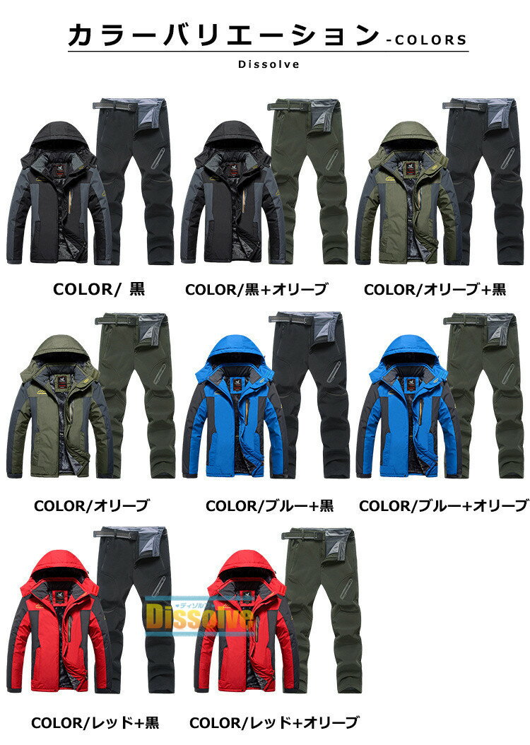 商品情報 商品名 マウンテンパーカー 上下セット メンズ 裏起毛 アウトドアウェア セットアップ 上下 登山ウェア 防寒着 ボアジャケット クライミングパンツ 起毛パンツ 防風 撥水 暖かい アウトドア 登山 釣り 素材 ポリエステル カラー 黒|黒+オリーブ|オリーブ+黒|オリーブ|ブルー+黒|ブルー+オリーブ|レッド+黒|レッド+オリーブサイズ 各サイズの寸法については画像のサイズ表にご参照ください。 生産国 中国 包装について 環境保護の観点から、「簡易包装」を推進しております 明細書について 当店ではエコロジーと個人情報流出防止のため、ご指示の無い限り明細書を発行しておりません。 明細書を発行ご希望の場合は個別に承らせていただきます。 お手数おかけいたしますが、ご注文時に備考欄に明細書発行希望の旨、ご入力ください。 サイズについて ※日本サイズ表示ではなく、ご購入前にぜひともサイズ表をご確認ください。 ※サイズが合わない場合は交換(返品)をお承りさせて頂きます。(在庫処分の商品を除く) ※何かございましたら、お手数おかけいたしますが、商品到着から5日以内にご連絡をお願い致します。 在庫に関するお知らせ 当社では複数店舗を運営し他店舗でも販売しております為、万一、商品の品切れ等によりお届けできない場合、 またはお届けが遅れる場合がございます。 その際には当方よりメールにてご連絡を差し上げま すが、あらかじめご了承下さいますようお願い致します。 注意 ※機械による生産過程により、生地を織る際の糸の継ぎ目や多少のほつれなどが生じている場合がございます。 ※サイズは平置き、メジャー採寸を行っております。 実寸は商品によって若干の誤差が生じる場合がございます。予めご了承ください。 ※お客様のご覧になられますパソコン機器及びモニタなどの違い、また室内、室外での撮影により実際の商品素材の色と相違する場合もありますのでご了承下さい。 ※※ベルト、飾りやインナーなどは含みません。