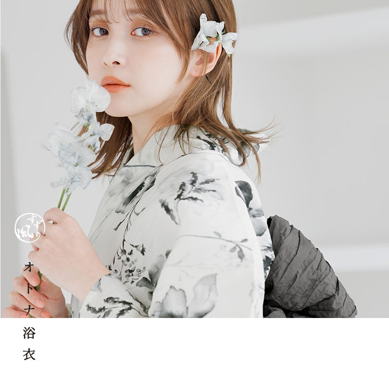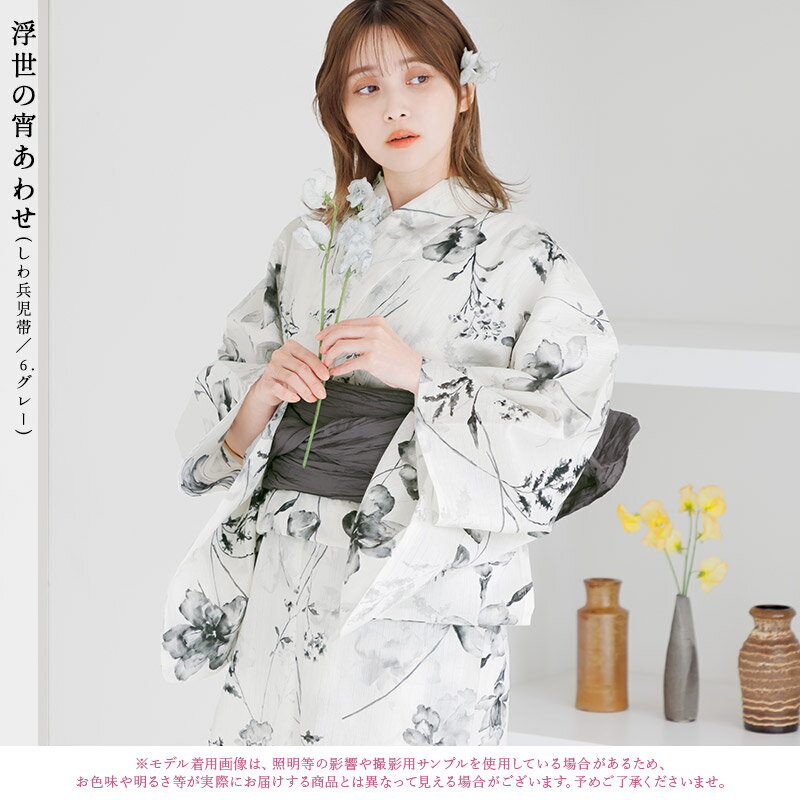 浴衣 5点セット レディース 2025 大人 可愛い 簡単(ゆかた・しわ兵児帯・下駄・着付け本・腰ひも)大人 可愛い お洒落 レトロ 白 黒 モノトーン シンプル 上品 水彩【浮世の宵あわせ】