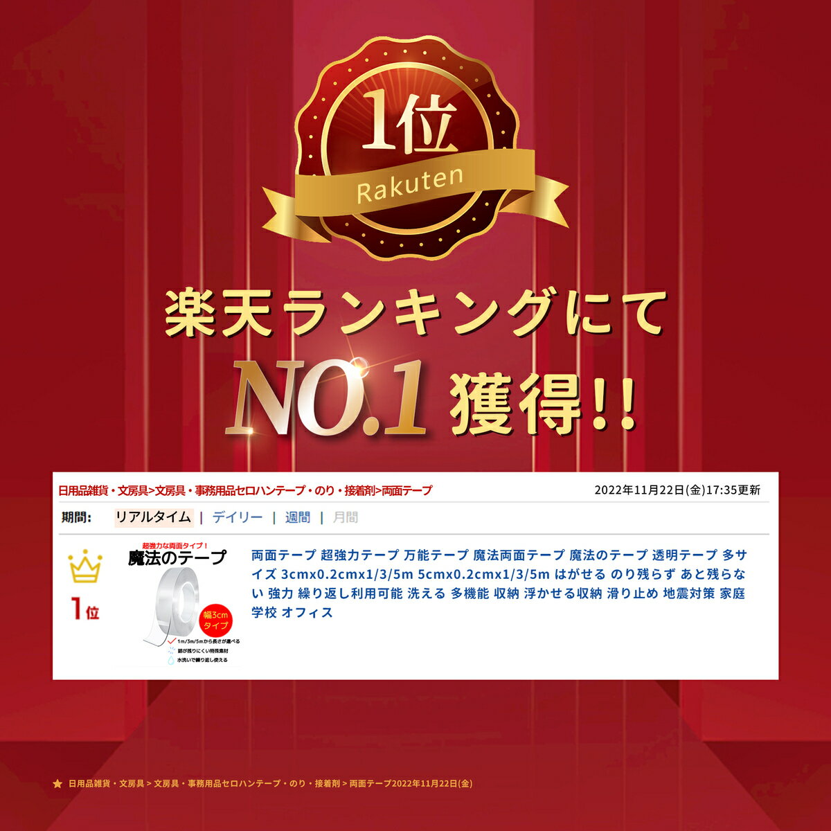 両面テープ ナノテープ 超強力テープ 万能テープ 魔法テープ 3cm×0.2cm×3M「楽天ランキング1位」魔法のテープ 透明テープ 多サイズ はがせる のり残らず あと残らない 強力 繰り返し利用可能 洗える 収納 浮かせる収納 滑り止め 地震対策 プレゼント付き 魔法の粘着力!お部屋がサッとキレイになる! ●話題の魔法両面テープ「浮かせる収納」という言葉を聞いたことがありますか?SNSで注目を集めている、いろんなものをしっかりと貼り付けられ、水で粘性を戻らせることができる、「魔法のテープ」です。●粘着性抜群&のり残らず無毒で匂いもしなく、リサイクルも可能なアクリルを使用しており、粘着力抜群で、さまざまなものを浮かせて収納できます。しっかり伸び、伸縮性に優れていて、簡単にキレイにはがせますので、表面にベタベタせず、壁などにも傷が付きにくい両面テープです。●水洗いで繰り返し使える魔法両面テープは特殊なゲル素材で作られているので、一回はがし水で軽く洗って乾燥させると、粘着力が戻り繰り返し使えます。ガラス、金属、セラミックタイル、革、大理石など広い素材に粘着適用しています。※粘着力が強いため、壁紙にお勧めしません。外す際は剥がれる可能性がございますので、ご注意ください。●幅広い用途と高い実用性小物の浮かせる収納はもちろん、フォトフレーム、掛け時計、収納棚、フック、玄関マットなどのズレ防止や地震対策にも!家中のあらゆるスペースが活躍の場に、アイデア次第で魔法両面テープの使い方は無限大です。●商品仕様種類:両面テープサイズ:3cmx0.2cmx1m3cmx0.2cmx3m3cmx0.2cmx5m5cmx0.2cmx1m5cmx0.2cmx3m5cmx0.2cmx5m 6種類ご用意しております。入数:1個素材:アクリル※こちらは3cmx0.2cmx3mタイプの商品ページです。 2