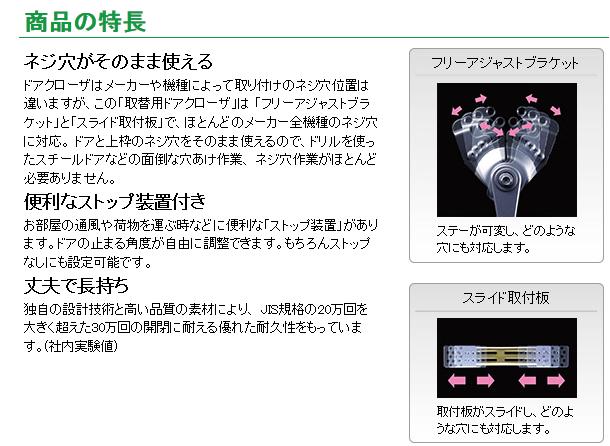 RYOBI(リョービ) 取替用ドアクローザー S200シリーズ S-203Pタイプ ※スチールドア用 ※木製ドア・アルミドアの“S-202Pタイプ”は コ コ をクリックして下さい。 壊れた! 調子が悪い! バタンと閉まる! オイルが漏れてる! でも、ドアクローザーは種類が多すぎて、どれが同じなのか分からない・・・ そんな時はコレ!! 現状のドアクローザーのネジの間隔や取り付け位置が適応範囲内なら、 メーカーを問わず交換が可能な万能タイプの 取り替えに特化したドアクローザーです! ※左右開き兼用タイプです。 ■対応チェックポイント!■ ※ご購入前に下記の点をご確認下さい。 現在ご使用のドアクローザー取り付け位置が下記の範囲内なら、ドアクローザーのメーカーを問わずお取替えが可能です。 ※このページで販売の製品は“S-203P(シルバー色)”“S-203P C1(ブロンズ色)”です。 ■ドアクローザーの取り外し方■