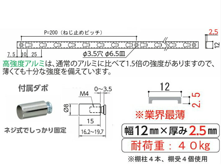 商品サイズ・材質 極薄2.5mmの棚柱です。 高強度アルミ製 ※高強度アルミは通常アルミの1.5倍の強度がありますので薄くても十分な強度がございます。 サイズ詳細は写真にてご紹介しておりますのでよろしくお願いいたします 高強度アルミ製 ミニダボ柱(面付用) サイズ幅12mm 厚み2.5mm 棚受ピッチ25mm ビス穴径3.5mm 全長1410mm (※多少の誤差がございます) ネジ止めピッチ200mm ※追加棚受は必ず極薄棚柱用棚受 ニッケル 商品コード:d-310bkをご使用ください。 セット内容アルミ面付棚柱 1410mm 4本 取付ビス ステンレス皿タッピングネジ3x25mm 32本 新型アルミ棚柱用棚受け 20個
