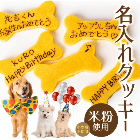 ギフト対応 犬用 名入れ クッキー メッセージ入れ 名入れの解説 砂糖を使用していないので、ダイエットや肥満、体重管理をしている犬にも適した低カロリーでナチュラルな食材のヘルシーな犬のケーキの飾りに出来る名入れクッキーです。 ドッグダイナーのオリジナルクッキーは、原材料を全て明記しているため、アレルギー犬(アレルギーのある犬)にも安心して与えられる手作りクッキーです。また、小麦アレルギーの犬にも配慮し、小麦粉不使用(グルテンフリー)の米粉を使用した犬用お菓子として、安心してお使いいただけます。 健康面だけでなく、見た目も可愛くインスタ映えするようデザインされたこのクッキーは、オリジナルケーキのネームプレートや、誕生日クッキーとしてもご利用いただけます。 カップケーキ(プチケーキ)のデコレーションや記念日クッキー、アニバーサリーの飾りとしても人気です。特別なクッキーを添えた手作りご飯の装飾としてもぜひどうぞ。 当店のクッキーは天然食を利用した健康食品として、日々のペット用おやつや犬へのプレゼントクッキーとしておすすめです 犬用名入れクッキーやペット用メッセージクッキーとしてお祝いクッキーやギフト用クッキーにも最適。愛犬に合わせて、オーダーメイドクッキーやカスタムクッキー、オリジナルメッセージクッキーをお楽しみいただけます。 カスタマイズクッキーとしてお好きなメッセージ(最大18文字)を入れることができるため、サプライズクッキーとしても最適です。お求め時にメッセージを指定いただければ、名前入りクッキーやペット向け名入れクッキーとして特別感を演出します。なお、こちらのオリジナル商品は、お求め後のキャンセルはお受けできかねますのでご了承ください。 犬用おやつとして、ドッグフードの補助や間食、軽食としてもご利用いただけます。 犬用 名入れ クッキー メッセージ入れ 名入れの詳細 『メッセージクッキー』(ケーキは別売り) 内容量 直径8cm 使用方法・賞味期限 ■冷蔵庫で18時間自然解凍。レンジをご利用の場合は、耐熱皿に入れて軽くラップをかけてご利用下さい ■賞味期限:冷凍で約3カ月(造りたてをお送りしてます) 解凍後は24時間でお召し上がり下さい。 給餌量 愛犬に合わせて調節して下さい 猫用としてご利用出来ますが、猫は嗜好性が高い為、食べない場合もございます。 原産国名 国産 (日本) 原材料 米粉・かぼちゃ(北海道産)・オリーブオイル・いなご豆 1枚当たり(約57kcal) たんぱく質1.3g・脂質2.1g・炭水化物8.0g・糖質7.5g・ナトリウム0mg・カリウム66mg・カルシウム4mg・マグネシウム6mg・リン20mg・食物繊維0.6g 配送方法 クール便(宅急便・冷凍)にて配送 ※同梱・送料に関しての詳細はコチラ 対象 小型犬(子犬)・大型犬・中型犬 幼犬(仔犬・パピー)成犬・高齢犬(シニア犬・シニア・老犬) 犬・猫・その他のペットにもご利用可能 【お問合せの多い犬種】 チワワ、 ダックスフンド、 プードル、 柴犬、 ヨークシャーテリア、 マルチーズ、 シーズー、 ミニチュア シュナウザー、 パグ、 キャバリア、 フレンチブルドック、 ラブラドール レトリバー、 ゴールデン レトリバー、 ジャーマンシェパード ラッピング ギフト包装・プレゼント包装は一律500円(税抜)(1包装あたり)お買い物カゴに入れた後に「ラッピング」をお選び頂きお求め下さい 名入れクッキー 名入り(ネーム入り)クッキーが付いてます ボーンの型(骨型・骨の型)をしたプレートのクッキーにメッセージを入れます(最大 18文字) 名前入りクッキーに入れたい文字をお買い求め時のコメント欄に必ずお書き下さい ご指定が無い場合は『Happy Birthday』とします オーダーメイドの特注(特別注文)メッセージクッキーです。 安心・安全 ・放射能検査済 ・オーガニック(有機) ・無添加・無着色・無香料・無農薬・添加物不使用・低脂肪 ・グルテンフリー ・ヒューマングレード 用途 ・誕生日ケーキ(バースデー・バースデイ ケーキ)のメッセージカードとして ・クリスマスケーキのメッセージプレートとして ・犬用ケーキの名入れクッキーとして ・クリスマスケーキの名入れプレートとして ・おやつ(ペット用おやつ・ペットのおやつ) ドッグダイナーのケーキはギフトにもおすすめ 誕生日、バレンタイン(ヴァレンタイン)、ホワイトデー、クリスマス、ハロウイン(ハロウイーン・ハロウィーン)、子供の日、ひな祭り(雛祭り)、お花見などプチギフトやプレゼントとして贈ってみませんか 友人へのギフト、お祝い、お土産、贈り物、お中元、お歳暮、お返し、冬ギフト、夏ギフト、贈答品、御礼(お礼)としても無添加なので安心してご利用頂けます。熨斗・のし 無料対応で贈り物にも最適です。 お買い物カゴに入れた後、お選び頂けます犬用 名入れ クッキー(ネーム入り クッキー)無添加 犬の誕生日 ケーキ 犬用ケーキと一緒にどうぞ メッセージ ネーム 名前が入るネームプレート(犬・ペット用)