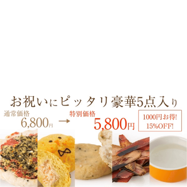 ギフト対応 犬 手作りご飯(犬用 手作りおやつ)の解説 犬用グルメセット(お得な詰め合わせ)です。 小型犬・中型犬・大型犬に対応しており、無添加・国産・無着色・保存料不使用のナチュラル素材で仕上げています。 5種類の商品を詰め合わせたセットで、まとめ買い(単品購入より15%お得)となっており、約1000円分お得にご購入いただけます 。 初めての方にも安心してお試しいただけるお試しセットとしても人気です。 (セット内容は人気商品を中心に構成されています) ・犬 ごはん 詰め合わせ ・犬 おやつ セット ・犬 健康食品セット ・犬用 無添加セット ・犬用 ナチュラルフード ・手作りごはん(手作りご飯にもおすすめ) 毎日の食事はもちろん、犬 誕生日 プレゼントや特別な日のギフト(犬の記念日やご褒美)にも最適です。 バースデープレゼントとしてもおすすめの犬用ギフトセットです。 特に「ひよこマン」は、ケーキをあげることに抵抗がある方にも選ばれているヘルシーなご褒美スイーツ(肉まん)です。 (低カロリースイーツのように与えられるとして人気) 食いつき抜群の内容で、愛犬の健康をサポートしながら楽しい食事時間をお届けします。 犬 手作りご飯(犬用 手作りおやつ)の詳細 グルメ 福袋 内容量 《ピザ》直径約10cm1枚 《ひよこまん》直径約10cm1個 《ダイエット ハンバーグ》直径約4cm×2個入り 《かつお ジャーキー》1袋 30g 《チキンスープ》約45cc 使用方法・賞味期限 冷凍食品は、レンジで温められます。 耐熱皿に入れラップを軽く掛けレンジで解凍・温め下さい ■賞味期限は袋に明記されております。 3カ月の賞味期限の商品をお送り致します。 冷凍庫で保管(解凍後は、24時間) 給餌量 愛犬の体重に合わせて与えて下さい。 猫やペットにもご利用出来ます 製造国名 国産 (日本) 原材料 《ピザ》 鶏肉・豆腐・おから・きゃべつ・にんじん・ほうれんそう・ごぼう・かぼちゃ・トマト・パン粉 (1枚当たりカロリー:約184kcal)  たんぱく質21.7g・脂質3.4g・炭水化物9.7g・鉄1.2mg・カルシウム70mg・マグネシウム40mg・ナトリウム75mg・ ビタミンC5mg・食物繊維2.9g 《ひよこまん》 薄力粉・ベーキングパウダー・いなご豆・にんじん・鶏(鶏肉・ささみ)・ウコン (1個当たりカロリー:約268kcal)  タンパク質:27.3g・脂質:2.7g・炭水化物:28.4g・ナトリウム:176mg・カルシウム:69mg・マグネシウム:46mg・食物繊維:1.1g 《ダイエット ハンバーグ》 鶏肉・豆腐・おから・きゃべつ・にんじん・ほうれんそう・ごぼう・かぼちゃ・パン粉 (1個当たりカロリー:約40kcal)  たんぱく質3.9g・脂質0.8g・炭水化物4.6g・鉄0.3mg・カルシウム19mg・マグネシウム12mg・ナトリウム27mg・ ビタミンC3mg・食物繊維1.1g 《かつお ジャーキー》 焼津産 鰹 (100gあたり 約356kcal)  たんぱく質77.1g・脂質2.9g・ナトリウム130mg・炭水化物0.8g・カリウム940mg・マグネシウム28mg ・ビタミンC0mg 《チキンスープ》 鶏胸肉スープ・野菜エキス(人参・いんげん・パプリカ) (100gあたり 約95kcal)  たんぱく質6.3g・脂質5.4g・炭水化物1.8g・鉄0.6mg・カルシウム6mg・マグネシウム12mg・ナトリウム11mg・ ビタミンC0mg・食物繊維0.3g  配送方法 冷凍食品(冷凍便・冷凍配送)【送料無料】 冷凍して配送する冷凍ご飯(冷凍おやつ)です。 送料や同梱に関しての詳細はコチラ 対象 犬用 猫用 ,全犬種、全猫種、オールステージ対応 (幼犬・幼猫・子犬・子猫・成犬・成猫・老犬・老猫・高齢犬・高齢猫・シニア・シニア犬・シニア猫) の犬用 猫用 サプリです。 【お問合せの多い犬種】 チワワ、 ダックスフンド、 プードル、 柴犬、 ヨークシャーテリア、 マルチーズ、 シーズー、 ミニチュア シュナウザー、 パグ、 キャバリア、 フレンチブルドック、 ラブラドール レトリバー、 ゴールデン レトリバー、 ジャーマンシェパード 安全・安心 ・放射能検査済み ・オーガニック(有機) ・無添加 ・無着色 ・無香料・添加物不使用・ヒューマングレード ・無農薬 用途 ・手好き嫌いの多い犬(嗜好性の高い犬)の栄養補給 ・手造り食の補助食として、犬のお誕生日やお祝いの手造りおやつとしてご利用下さい ・アレルギーのある犬の健康のサポート ・肥満(体重管理)が必要な犬のダイエットのサポート出来る健康食品 ・犬のおやつ、手作りおやつ ・ドッグフードや手作り食のトッピング ・いぬの間食やお菓子、軽食としてご利用出来る、ペット用おやつ ・手作りごはんとして ・ペットのおやつとして ドッグダイナーの犬のおやつはギフトにもおすすめ 誕生日、バレンタイン(ヴァレンタイン)、ホワイトデー、クリスマス、ハロウイン(ハロウイーン・ハロウィーン)、子供の日、ひな祭り(雛祭り)、お花見などプチギフトやプレゼントとして贈ってみませんか 友人へのギフト、お祝い、お土産、贈り物、お中元、お歳暮、お返し、冬ギフト、夏ギフト、贈答品、御礼(お礼)、お誕生日プレゼント、バースデイプレゼント、としても無添加なので安心してご利用頂けます。 ドッグダイナーの犬用おやつ 犬のオヤツです