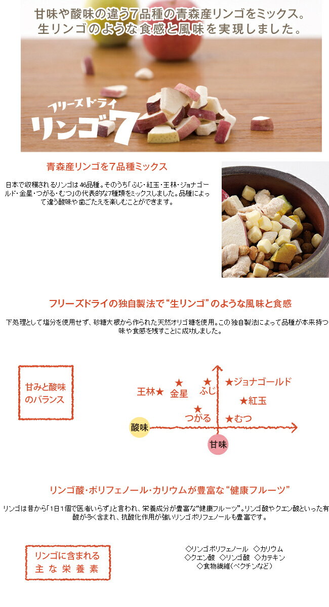 ■ドットわんリンゴ7■ ・・・・・・・・・・・・・・・ 日本で収穫されるリンゴは46品種。そのうち「ふじ・紅玉・王林・ジョナゴールド・金星・つがる・むつ」の代表的な7種類をミックスしました。品種によって違う酸味や歯ごたえを楽しむことができます。 下処理として塩分を使用せず、砂糖大根から作られた天然オリゴ糖を使用。この独自製法によって品種が本来持つ風味や食感を残すことに成功しました。 リンゴは昔から「1日1個で医者いらず」と言われ、栄養成分が豊富な"健康フルーツ"。リンゴ酸やクエン酸といった有機酸が多く含まれ、抗酸化作用が強いリンゴポリフェノールも豊富です。 原産国 日本 原材料 国産リンゴ7品種、トレハロース 成分 粗たんぱく質 1.0%以上 粗脂質 3.0%以上 粗繊維 8.3%以下 粗灰分 1.1%以下 水分 1.7%以下 定価価格 8g 495円(税込) 20g 1166円(税込) 関連商品 ★その他のドットわんの商品はこちら★ ★その他のおやつ類はこちら★