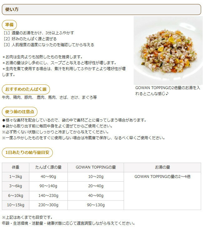 ★こちらの商品は取り寄せ商品となります★ ご注文日から2日〜3日での発送を心掛けておりますが、商品によっては発送までに1週間程度のお時間がかかる場合もございます。 他の商品と一緒にご注文の際は余裕を持ってご注文下さい。 ご注文を確定いただいた後、当店からメーカーへ商品を発注した時には在庫が品切れになっている場合もございます。 その際には追ってメールにてご連絡致しますので、当店からのメールを受け取れるようメール設定のご確認をお願い致します。 ※尚、購入後の変更・キャンセルはご遠慮いただいたおります。ご了承ください。 以上のことをお理解の上ご購入頂きますようお願い申し上げます。■ゴワン トッピング■ ・・・・・・・・・・・・・・・・・・・・ 愛犬の大好きなお肉やお魚と混ぜるだけで、愛情たっぷりごはんの完成 栄養素が豊富に含まれる17種類の素材を配合した、手作りごはんの補助となるドッグフードです。 保存料・香料等の添加物は不使用。 食べ慣れたドライフードへのトッピングとしてもご利用いただけます。 保存方法 ・直射日光・高温多湿を避けて、冷暗所で保管してください。 ・開封後はしっかりと封を閉じ(密封し)、冷暗所で保存してください。 ・ペットや小さなお子様の手が届くところに保管しないでください。 注意事項 ※本品は犬用の一般食です。総合栄養食ではありません。 ※たんぱく源(動物性たんぱく質)は含まれませんので、別途ご用意ください。 ※新鮮な動物性たんぱく質と合わせてはじめてバランスの取れた食事となります。 ※生後3ヶ月未満のペットには与えないでください。 ・適切な量を、飼い主様の目の届く場所で与えてください。 ・開封後は早めにご使用ください。 ・体調に変化があった場合は、早急に獣医師に相談してください。 原材料 大麦、きゃべつ、にんじん、かぼちゃ、ホワイトソルガム、さつまいも、かたくちいわし、大豆、プロセスチーズ、ビーツ、DHA粉末、えごま、乳酸菌、まいたけ、ブロッコリー、スピルリナ、ビーポーレン 成分 粗たんぱく質 11.6%以上、粗脂肪 4.2%以上、粗繊維 3.0%以下、粗灰分 2.2%以下、水分 8.8%以下、リン 0.29% カロリー:353kcal/100g 原産国 日本 定価価格 80g 1,000円(税込1,100円) 500g 3,600円(税込3,960円) 関連商品 おやつの商品一覧はこちら トッピング商品の一覧はこちら ご注意ください 商品のカラーに関しましては、お使いのPC・モニター環境により、実際のカラーと若干異なることがございますので、あらかじめご了承の上、お買い求めください。