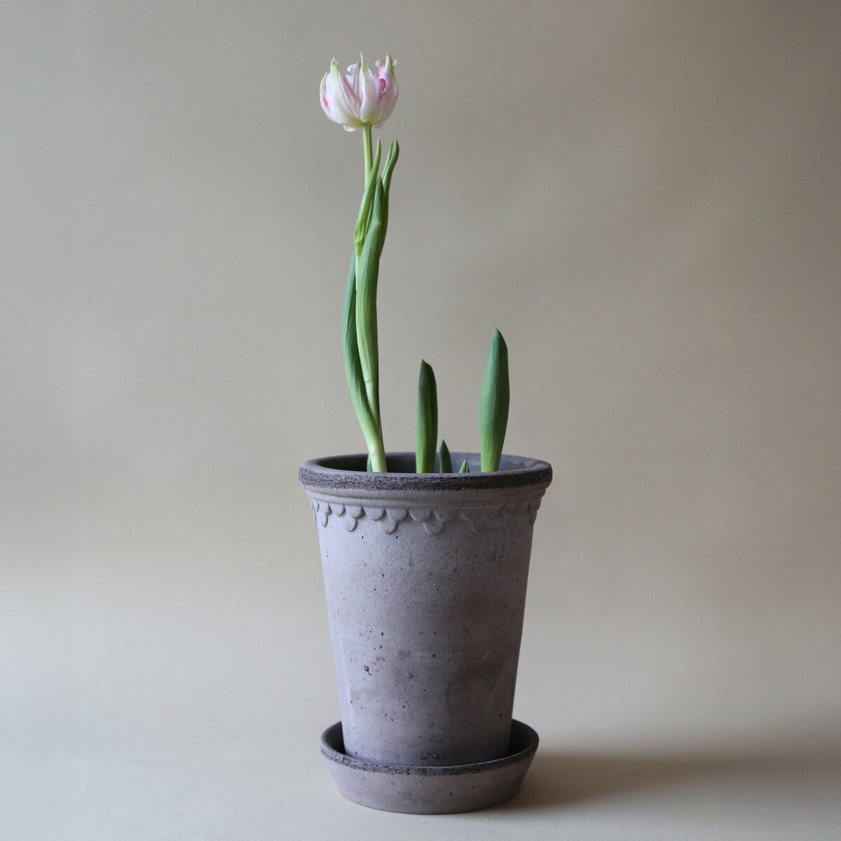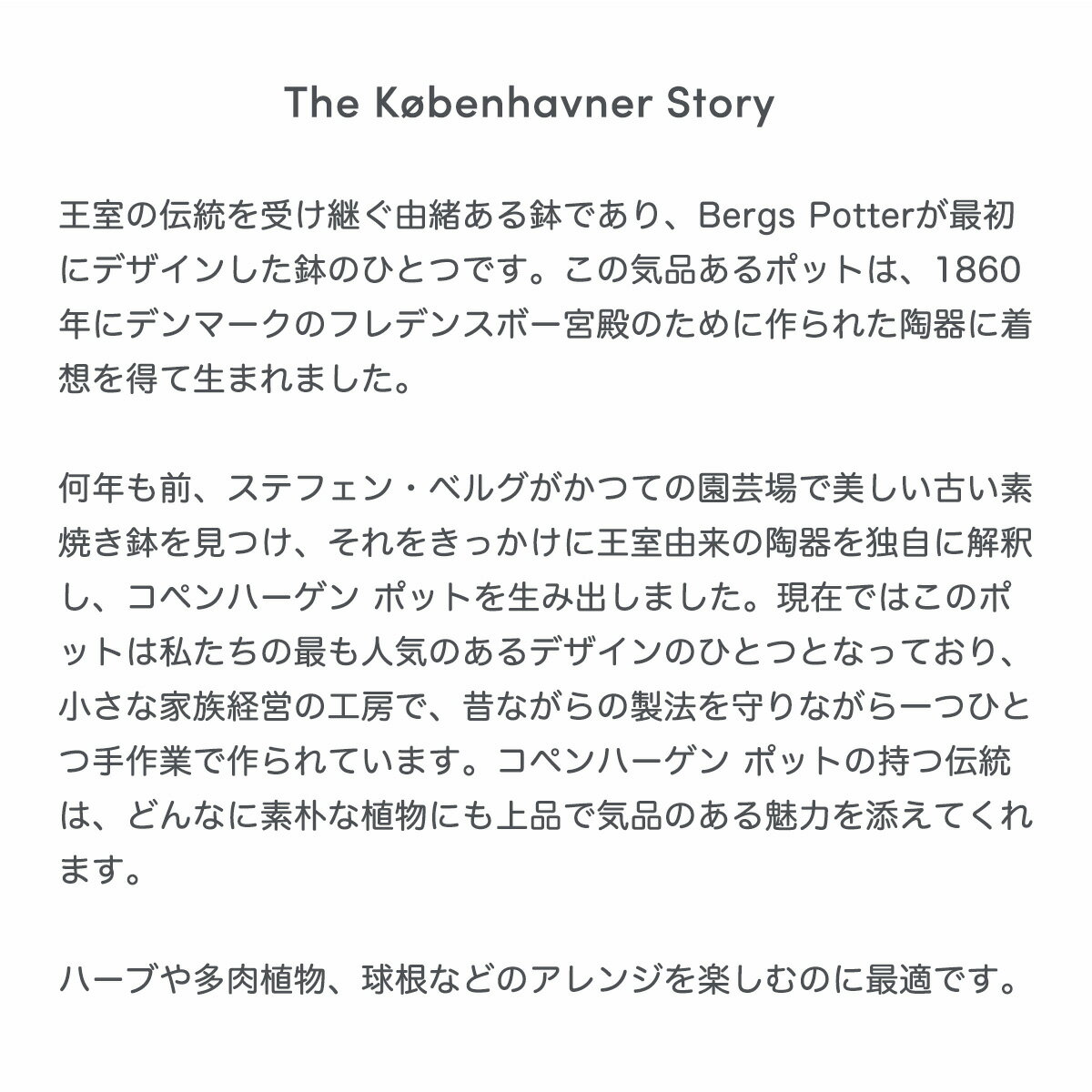 サイズ 直径10×高さ14cm 直径14×高さ19cm 直径18×高さ24cm ※ソーサー(受け皿)付きです カラー グレー ナチュラル 素材 テラコッタ 原産国 イタリアBERGS POTTER(バーグスポッター) BERGS POTTER(バーグスポッター)は、第二次世界大戦中の1942年にデンマークで誕生した陶器ブランドです。 イタリア産の高密度で耐久性に優れた粘土を使用し、現在も小さな家族経営の工房で、熟練した職人たちが一つひとつ丁寧に手作業で製造しています。BERGS POTTERの鉢は、高温でしっかりと焼き締められた素焼き製。通気性と保水性に優れ、植物の根が呼吸しやすい環境を保つことで、健やかな成長をサポートします。さらに、植物とともに年月を重ねることで、土や水分を吸い込み、風合いが深まり美しく変化していくのも大きな魅力です。 また、デンマーク王室や歴史的な建築、自然や街並みにインスパイアされたデザインやカラーリング、厚みのある釉薬(鉢の表面に塗布されたガラス質)など、シンプルでありながらも上質さを感じさせる美しさが特徴です。素材と製法、そしてデザインすべてにこだわったBERGS POTTERの鉢は、使い込むほどに味わいを増し、植物の魅力をより一層引き立ててくれます。ヨーロッパやアメリカをはじめ、世界中のガーデナーから愛されている理由が、そこにあります。 -COPENHAGEN- 何年も前、ステフェン・ベルグがかつての園芸場で美しい古い素焼き鉢を見つけ、それをきっかけに王室由来の陶器を独自に解釈し、コペンハーゲン ポットを生み出しました。現在ではこのポットは私たちの最も人気のあるデザインのひとつとなっており、小さな家族経営の工房で、昔ながらの製法を守りながら一つひとつ手作業で作られています。コペンハーゲン ポットの持つ伝統は、どんなに素朴な植物にも上品で気品のある魅力を添えてくれます。ハーブや多肉植物、球根などのアレンジを楽しむのに最適です。 注意事項 ・ソーサー(受け皿)付きです。 ・焼成・乾燥工程などでの伸縮により、サイズや色に若干の個体差があります。 ・ご使用の環境(パソコンのモニターやスマートフォンの画面等)などにより、色や風合いが写真と実物では若干異なる場合がございます。