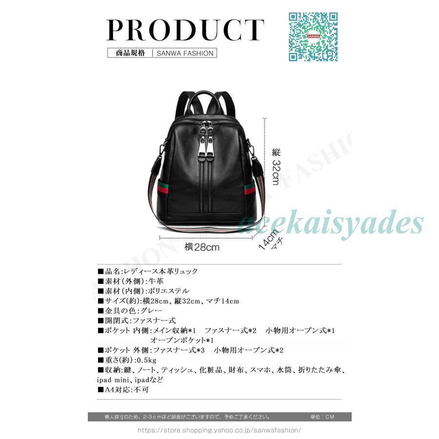 ■品名:レディース本革リュック■素材(外側):牛革■素材(内側):ポリエステル ■サイズ(約):横28cm、縦32cm、マチ14cm■金具の色:グレー ■開閉式:ファスナー式■ポケット 内側:メイン収納*1 ファスナー式*2 小物用オープン式*1 オープンポケット*1 ■ポケット 外側:ファスナー式*3 小物用オープン式*2 ■重さ(約):0.5kg■収納:鍵、ノート、ティッシュ、化粧品、財布、スマホ、水筒、折りたたみ傘、ipad mini、ipadなど■A4対応:不可検索ワード:新作 トレンド 流行 カジュアル 革バッグファッション レザーバッグ レザー かばん おしゃれ鞄 レディース コーデ 通勤 通学 大人可愛い かわいい 女性 大人通販 人気 カジュアル 肩掛け 20代 30代 40代ミセス ミニミニショルダー シンプル きれいめキレイめ 収納 人気 おすすめ