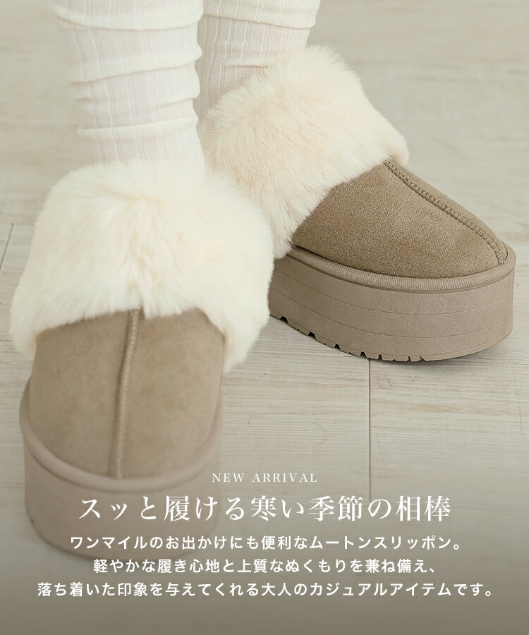 ■商品名 pufe 厚底ムートンスリッポン ■サイズ(cm) S(約23.0cm) ストーム 約5、ヒール 約5.5、甲幅 約16、底幅 約10 重量 片足 約378g M(約23.5cm) ストーム 約5、ヒール 約5.5、甲幅 約16、底幅 約10 重量 片足 約400g L(約24.0cm) ストーム 約5、ヒール 約5.5、甲幅 約16.5、底幅 約10 重量 片足 約412g LL(約24.5cm) ストーム 約5、ヒール 約5.5、甲幅 約16.5、底幅 約10.1 重量 片足 約420g ※平採寸のため若干のブレがございます。 ★STAFFが試着しました★ 【STAFF N】 買うならS(約23.0cm) ・足のサイズ:22.5cm ・甲高/幅広 S(約23.0cm)サイズがピッタリでした。 中のファーがふわふわで、足に密着するのでとっても暖かかったです。 ファーが馴染んでくると思うのでぴったりサイズのS(約23.0cm)をオススメします。 低身長なので、厚底で脚長効果大なのが嬉しいポイント! 丈長めのゆるっとパンツと合わせて履きたいと思います。 【STAFF M】 買うならM(約23.5cm) ・足のサイズ:23.0cm ・甲高/幅普通 M(約23.5cm)を靴下で試着しましたがピッタリでした。 足入れしてすぐは中のファーのボリュームがあるので、きつめかな?と思いましたが、履いているうちに自分の足にファーが馴染んでくるので、厚手の靴下でも履けると思います。 手を使わずにサッと履けるので、子供とのお出かけ時に大活躍させたいです。 【STAFF R】 買うならL(約24.0cm) ・足のサイズ:23.5cm ・甲普通/幅普通 M(約23.5cm)を履いてみたところ、ぴったりサイズで小さめに感じました。 L(約24.0cm)はややゆとりのあるサイズ感で、着脱がとても楽で履きやすかったです。 スリッポンタイプなので、買うならさっと履けるL(約24.0cm)を選びます。 【STAFF O】 買うならLL(約24.5cm) ・足のサイズ:24.0cm ・甲高/幅広 素足で履きましたが、とてもふわふわで中のファーのボリュームもあるのでピッタリなサイジングでした。 ファーが馴染んできたら、より履きやすくなりそうです。 手を使わずにサッと履けて、厚底なので履くだけでトレンド感が出ます。 ■カラー ブラック、ライトベージュ、キャメル ■素材 [アッパー]合成繊維(ポリエステル90%、ナイロン10%) [底]合成底 ■商品説明 脚長効果抜群の厚底ムートンスリッポンが登場。 柔らかい素材で歩きやすく、クッション性もバッチリ。 中はボリューミーで贅沢なふわふわなもこもこな裏起毛なので、寒い時期には暖かく過ごすことができます。 スカートはもちろん、スリッポンなので、パンツとの相性も抜群です。 ■ご注意 ■製造工程上、多少のシワやステッチのずれ、接着剤のはみ出しが見られる場合がございます。 いずれも使用に支障のない範囲と判断した商品をお届けしております。 環境保全の観点からも、何卒ご理解とご協力をお願い申し上げます。 ■入荷時期によりお色、長さが多少異なる場合がございます。 ■撮影場所やイメージにより実際の商品と色味が若干異なる場合がございます。商品のお色味はカラーバリエーション画像をご参照ください。 ■なるべくきれいな状態で発送致しますが、製造工程上、輸送の際の汚れや擦れ等が若干見られる場合がございます。 ■雨、摩擦により色落ちする場合がございます。 あらかじめ上記事項をご理解ご了承のうえ、お買求めくださいませ。
