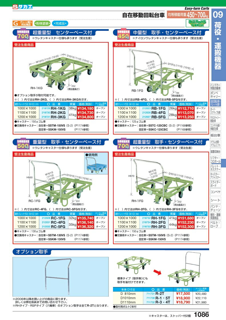 【完成品】 【受注生産】《商品説明》●使ってみて初めて良さが分かる自在移動回転台車●グリーン購入法適合商品《商品スペック》●外寸:W1110×D1110mm●均等積載荷重:700kg●カラー:サカエグリーン●質量:41kg●キャスター:150φゴム車●メーカー名:サカエオリジナルブランド●掲載カタログ:SAKAE2025総合カタログ1086ページ《商品情報》●ウレタンキャスター仕様も承ります(受注生産)●荷台面高さ:252●適応サイズ:W1100×D1100mm【配送料について】●大型商品の為、一部配達が出来ない地域や、別途送料が必要な場合がございます。※特に北海道のお客様はご注意下さい。●その場合は、ご注文後にメールで送料を含む合計金額をお知らせ致します。●送料が別途必要な場合は、ご注文後のキャンセルもお受け致します。お気軽にご注文下さいませ。●尚、送料が無料の場合は、そのまま出荷手配をさせて頂きます。【お支払い方法について】●こちらの商品はメーカーからの直送となります。代金引換のお支払い方法はご利用になれません。●代金引換にてご注文頂いた場合はご注文をキャンセルとさせて頂く場合がございますので予めご了承下さいませ。【完成品】 【受注生産】《商品説明》●使ってみて初めて良さが分かる自在移動回転台車●グリーン購入法適合商品《商品スペック》●外寸:W1110×D1110mm●均等積載荷重:700kg●カラー:サカエグリーン●質量:41kg●キャスター:150φゴム車●メーカー名:サカエオリジナルブランド●掲載カタログ:SAKAE2025総合カタログ1086ページ《商品情報》●ウレタンキャスター仕様も承ります(受注生産)●荷台面高さ:252●適応サイズ:W1100×D1100mm
