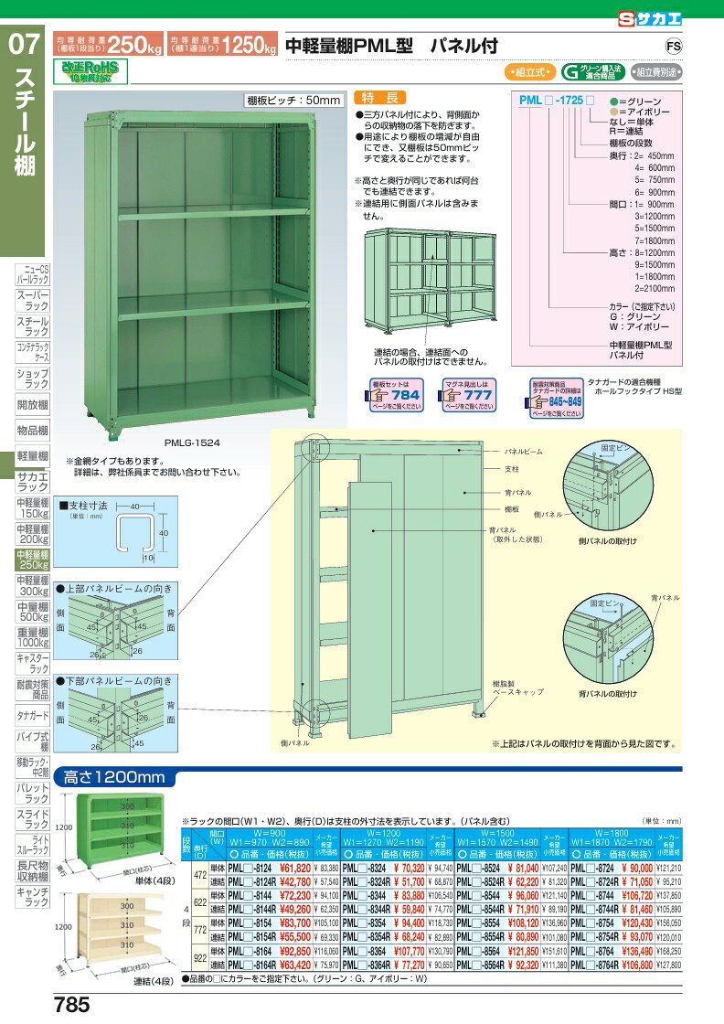 【組立式】 【組立費別途】 《商品説明》●三方パネル付により、背面からの収納物の落下を防ぎます。●グリーン購入法適合商品《商品スペック》●寸法:W1800×D600×H1200mm●段数:4段●耐荷重(棚1段当り):250kg●耐荷重(棚1連当り):1250kg●本体色:グリーン●メーカー名:サカエオリジナルブランド●掲載カタログ:SAKAE2025総合カタログ785ページ《商品情報》●50mmピッチ段替え可能●注意事項:棚板段数は、天棚及び底棚を含みます。【配送料について】●こちらの商品はお届け先により配送料が異なります。●また、荷降ろしの為フォークリフト等の設備が必要な場合がございます。●ご注文後にメールにてご案内させて頂きます。※事前にお問合せ頂いても構いません。【お支払い方法について】●こちらの商品はメーカーからの直送となります。代金引換のお支払い方法はご利用になれません。●代金引換にてご注文頂いた場合はご注文をキャンセルとさせて頂く場合がございますので予めご了承下さいませ。【組立式】 【組立費別途】 《商品説明》●三方パネル付により、背面からの収納物の落下を防ぎます。●グリーン購入法適合商品《商品スペック》●寸法:W1800×D600×H1200mm●段数:4段●耐荷重(棚1段当り):250kg●耐荷重(棚1連当り):1250kg●本体色:グリーン●メーカー名:サカエオリジナルブランド●掲載カタログ:SAKAE2025総合カタログ785ページ《商品情報》●50mmピッチ段替え可能●注意事項:棚板段数は、天棚及び底棚を含みます。